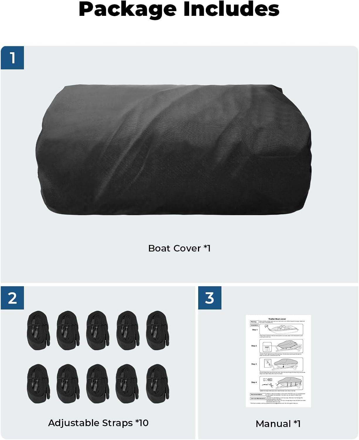 【Wide Compatibility】Available in three different sizes, our boat cover fits a variety of boats, including V-Hull, Pro-Style, fishing boats, runabouts, bass boats, and pontoon boats. It ensures a secure fit, offering comprehensive protection for your vessel in any weather.