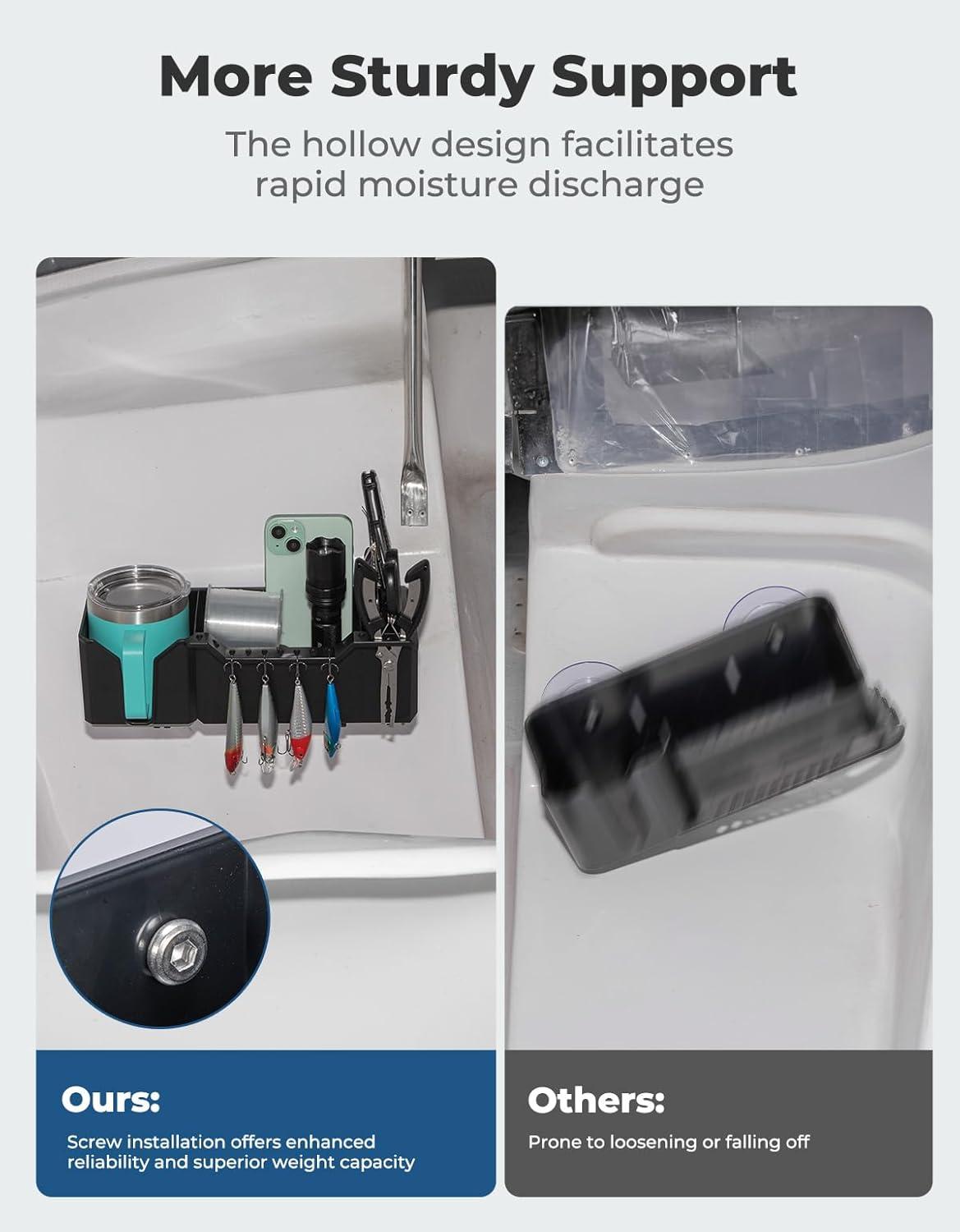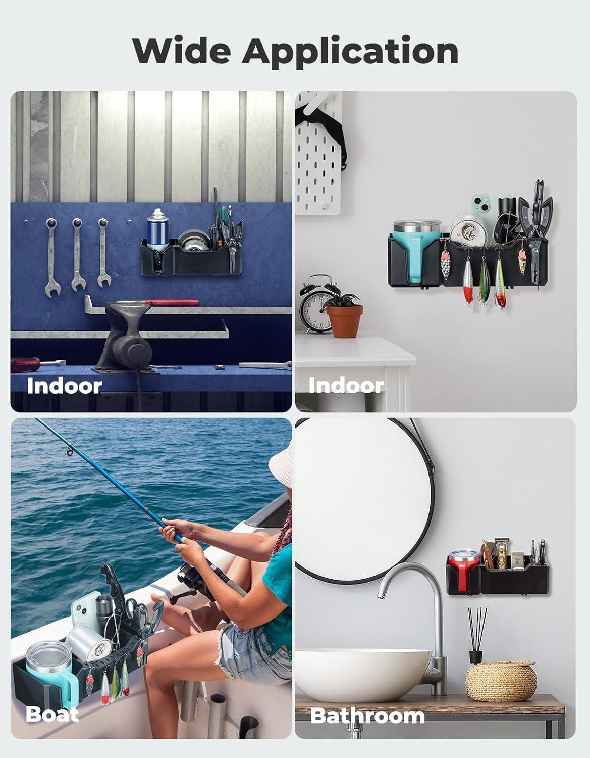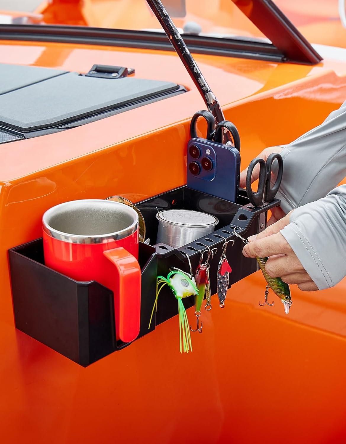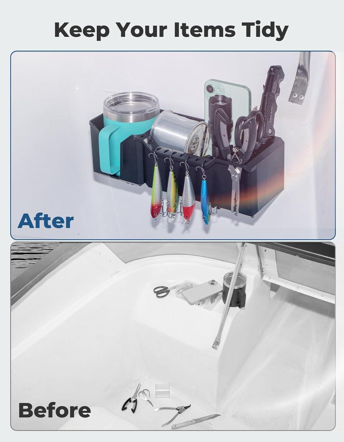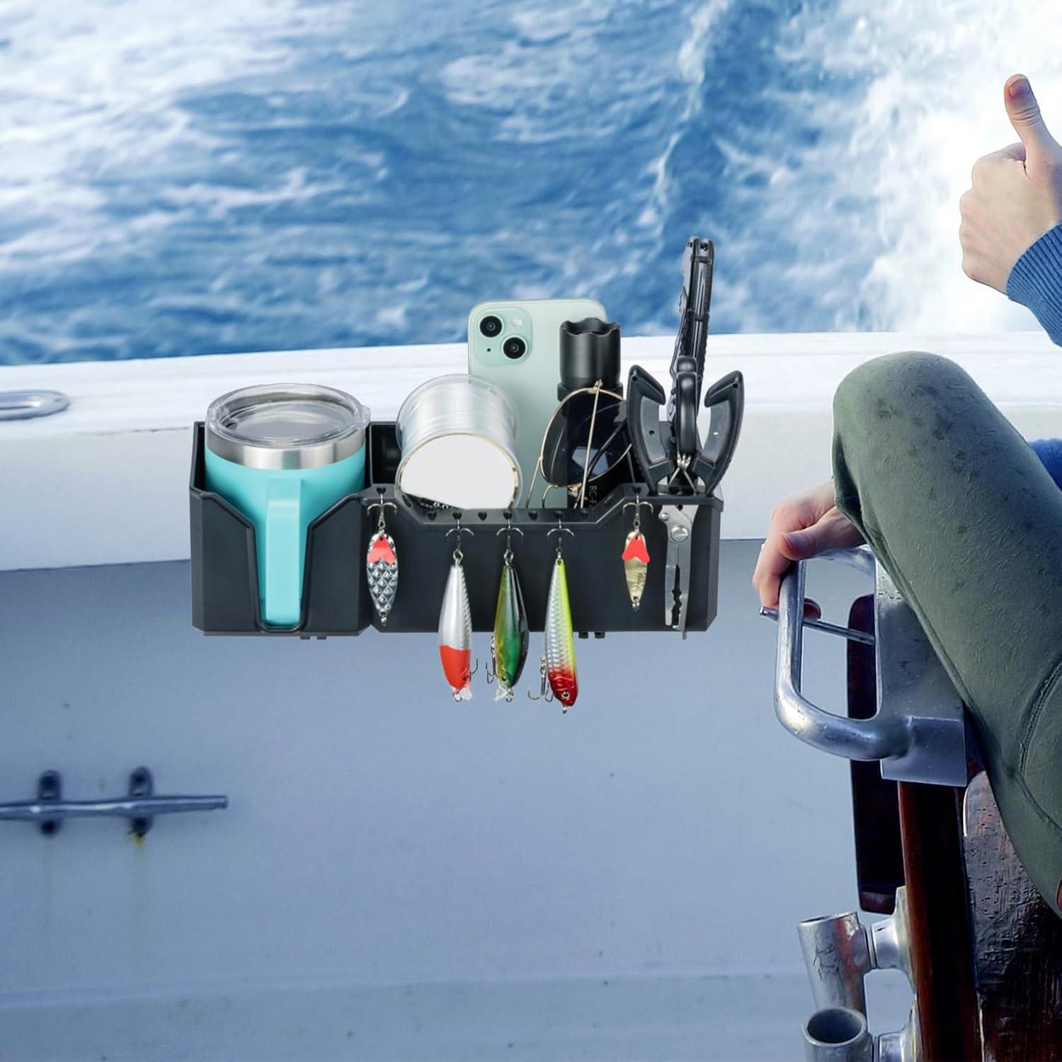 Keep Your Cabin Clean and Tidy: The boat caddy organizer can hold your drinks, gadgets, and other essentials. With its strategically placed holes along the edge, you can conveniently hang your fishing lines, bait, small knives, pliers, and tweezers, ensuring your gear is always in perfect order and readily accessible.