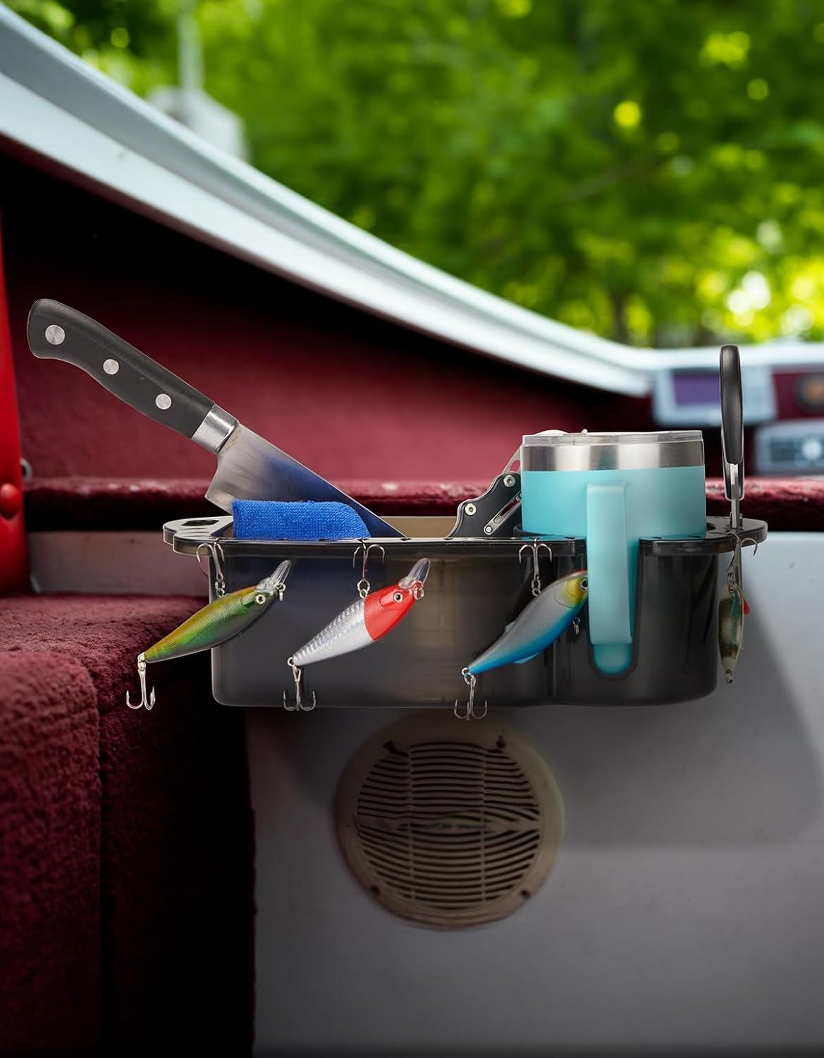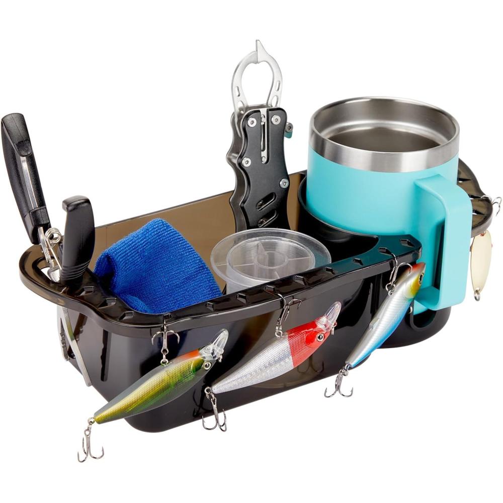 This boat organizer can hold your drinks, gadgets, pliers, knives, and more. The holes around the edge are great for hanging fishing lures. Whatever items you need, it always holds them in place and keeps them tidy