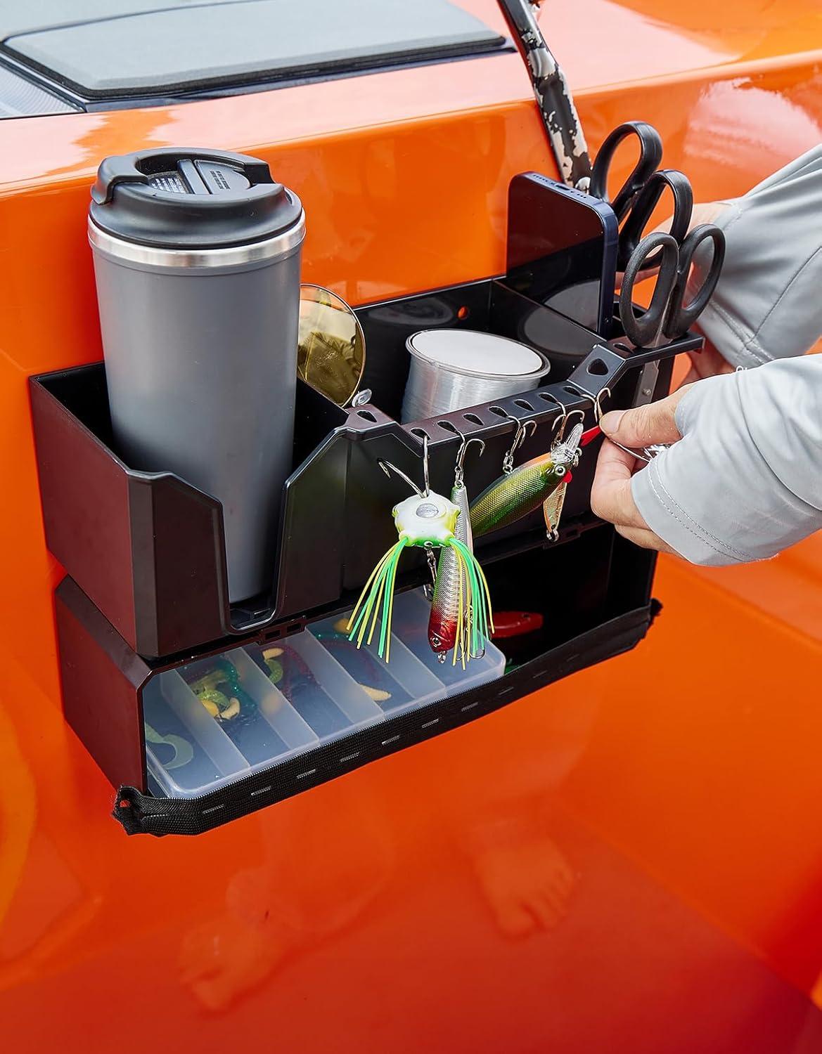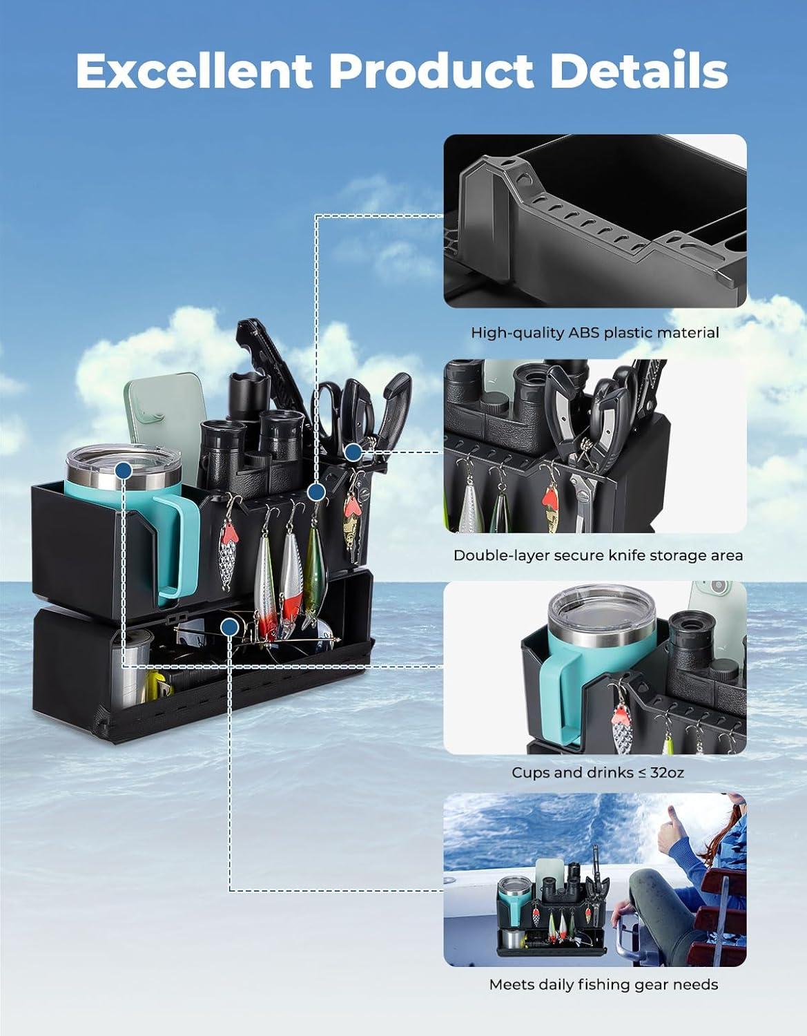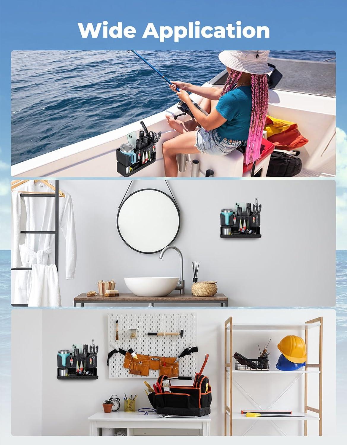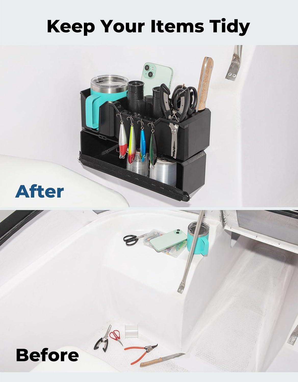 Keep Your Cabin Clean and Tidy: The boat caddy organizer can hold your drinks, gadgets, and other essentials. With its strategically placed holes along the edge, you can conveniently hang your fishing lines, bait, small knives, pliers, and tweezers, ensuring your gear is always in perfect order and readily accessible.