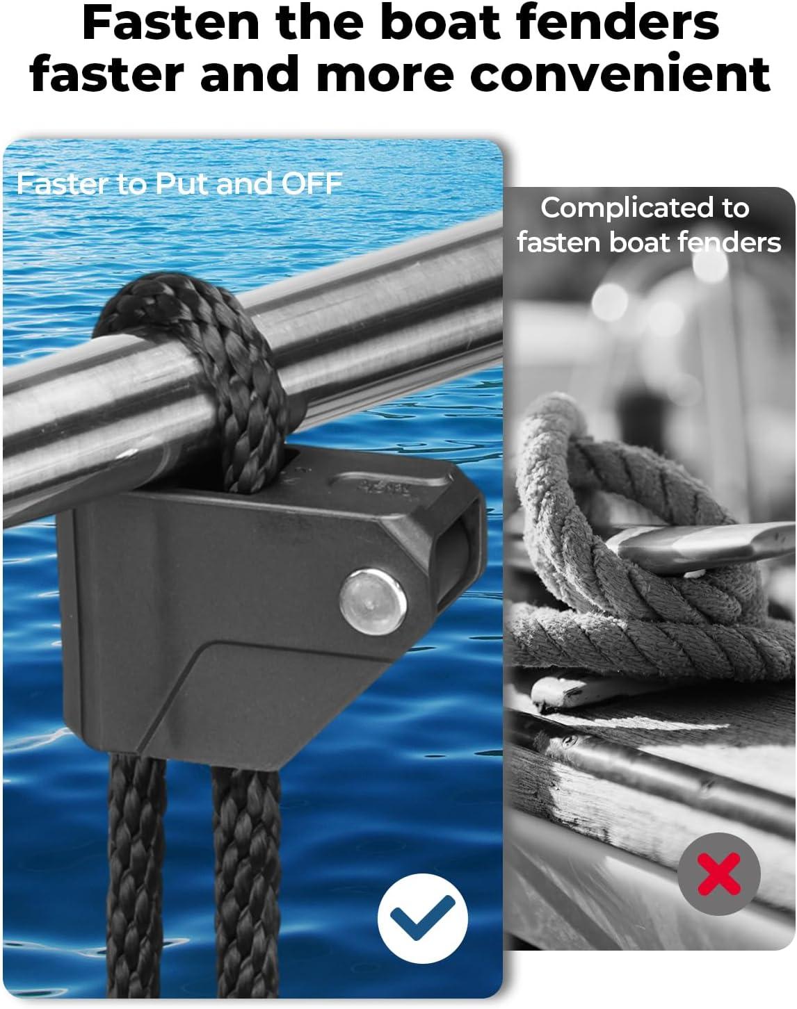 Versatile Attachment: Boat bumper clips securely attaches to a wide range of square or round tubing railings or boat cleats, making it compatible with most boat fenders for fast repositioning.