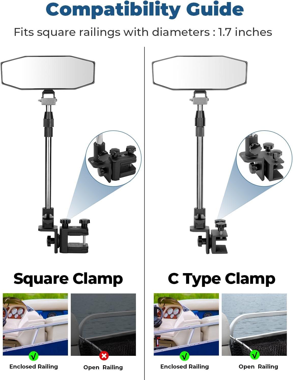 Hassle-Free Installation: Easily install our boat rearview mirror with the thumbscrews provided, attaching and removing as needed without any tools. (Fits a closed square railing with a maximum diameter of 1.7 inches)
