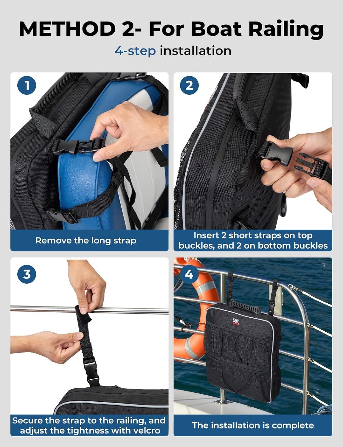 Various Mounting Options: The storage bag offers versatile fixing options; it can be secured to the boat's railing, or the back of a chair, or just carry it with the grab handle.
