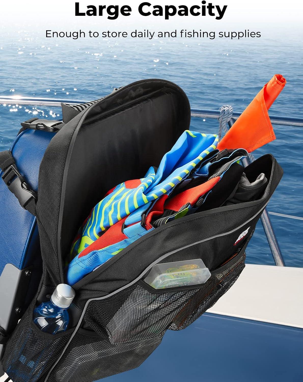 Large Capacity Design: The boat backpack is spacious enough to accommodate life jackets, tackle trays, and other essential items for your boating trip. It also features 7 individual mesh pockets to store small items, such as sunglasses, cell phones, and sunscreen.