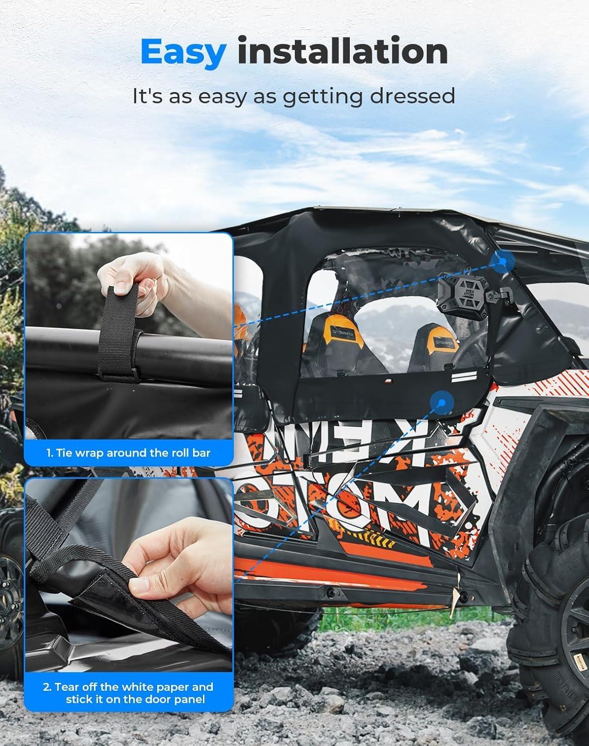 Easy Installation: Installs in just two easy steps: tie and stick. It's as simple as getting dressed. Meanwhile, the strap features an anti-slip design, allowing it to be securely fastened to the roll cage so that every strap can be tightened, thereby improving the overall seal