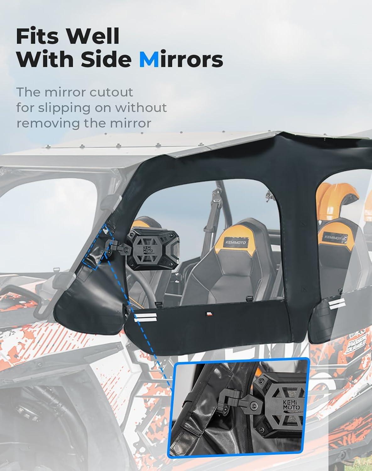 Fits Well with Side Mirrors: The KEMIMOTO soft cab enclosure features distinctive mirror cutouts, allowing easy installation without removing the mirrors. The slots are wide enough for most UTV side mirrors and do not obstruct rearview visibility
