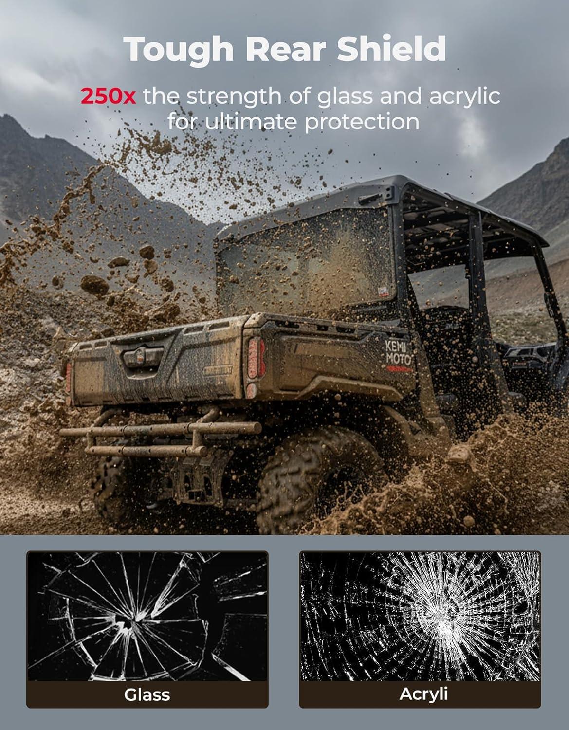 Durable Polycarbonate: The KEMIMOTO back windshield is made of polycarbonate, which is 250 times stronger than glass. It's impact-resistant, shatterproof, and corrosion-resistant, making it perfect for extreme outdoor environments. To prevent scratches, we recommend using soft materials and professional cleaning methods