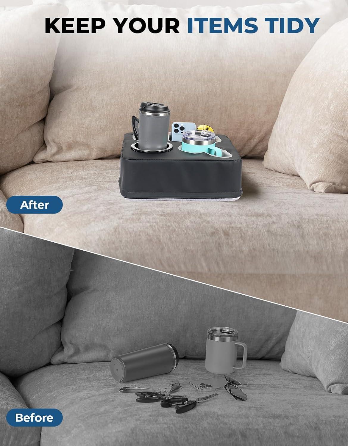 【Long-Lasting and Stable】Crafted from high-quality materials and featuring foam padding, this couch caddy with cup holder is built to last. Its dual cup holder design ensures stability, so you don't have to worry about your drinks or belongings falling over.