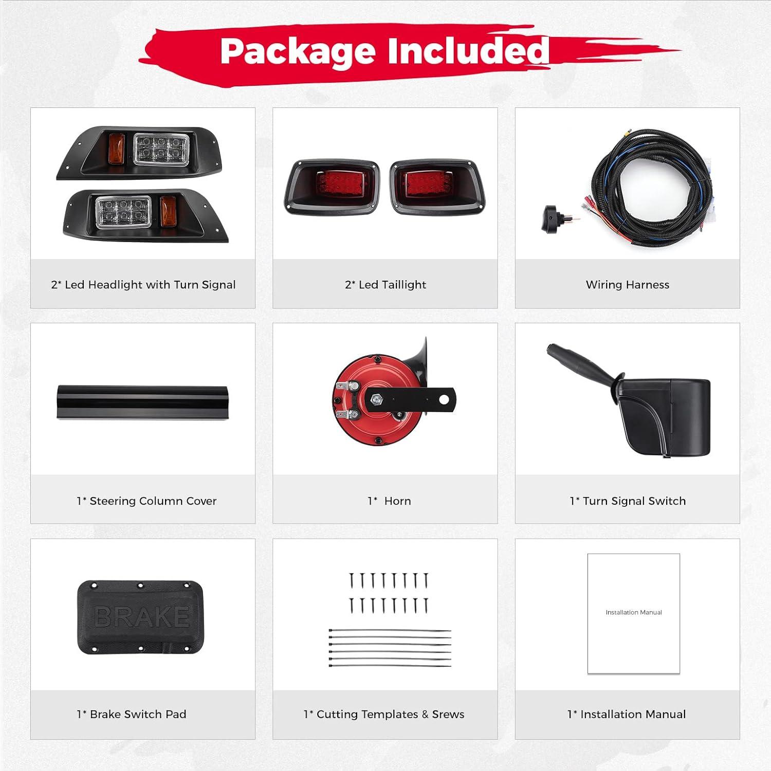 Package Included: The package includes 2 LED headlights with amber turn signals, 2 LED taillights, 1 horn, 1 control box, 1 turn signal switch, 1 steering wheel cover, 1 brake pad, a wiring harness, a cutting template, installation instructions, screws, and straps