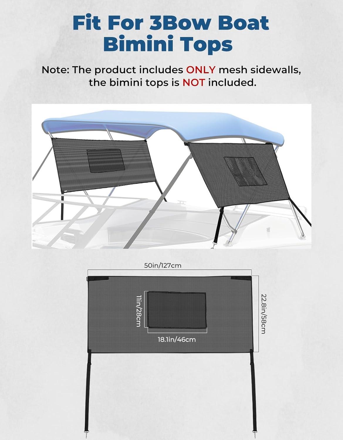 Compatibility: Detachable mesh sidewalls measures 50 inches long by 22.8 inches wide, fitting 3 Bow boat Bimini tops. This versatile cover is designed to easily fit various boat models, ensuring a snug and secure fit for different Bimini top configurations.