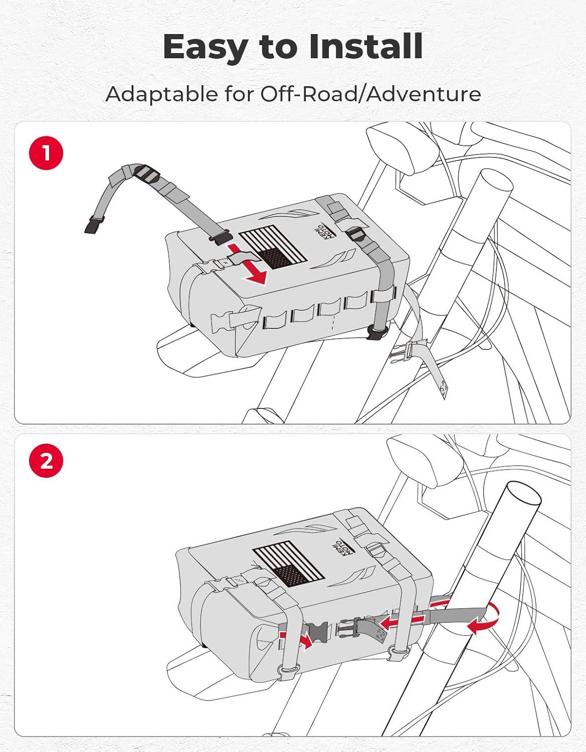 Straps & Buckles Design: Adventure Crash Bar Bag Has Horizontal and Vertical Tightening Straps to Reduce Shaking When Carrying Items. It Includes Adjustable Straps and Two Quick-Release Buckles for Secure Fastening, Along with a Top Buckle and Two Side Buckles for Added Stability