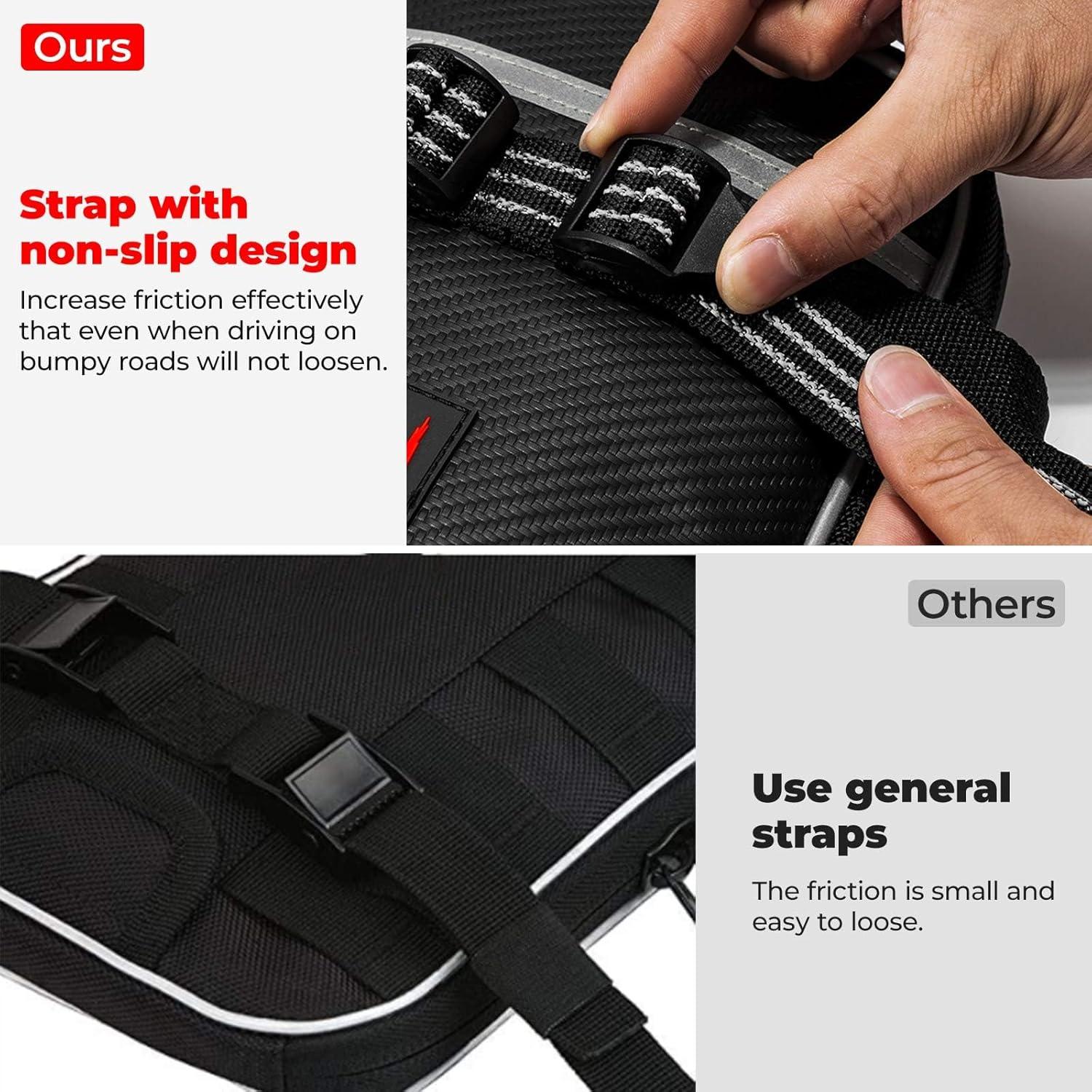 Anti Slip – The Bottom of the Tool Bag Is Made of Non-slip Fabric, Which Has a Certain Anti-Slip Effect. The Bag Is Fixed Not Only with Four Hooks That Can Be Hooked on the Fender, But Also with a Buckle on the Back That Is Stuck on the Bag.