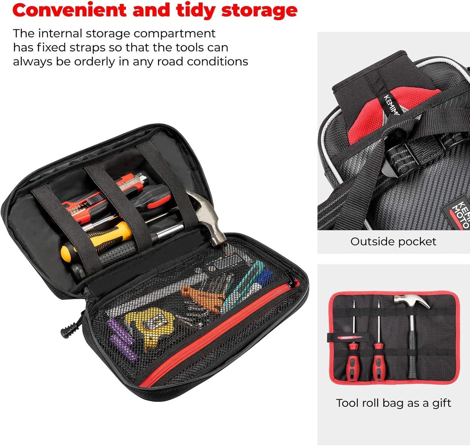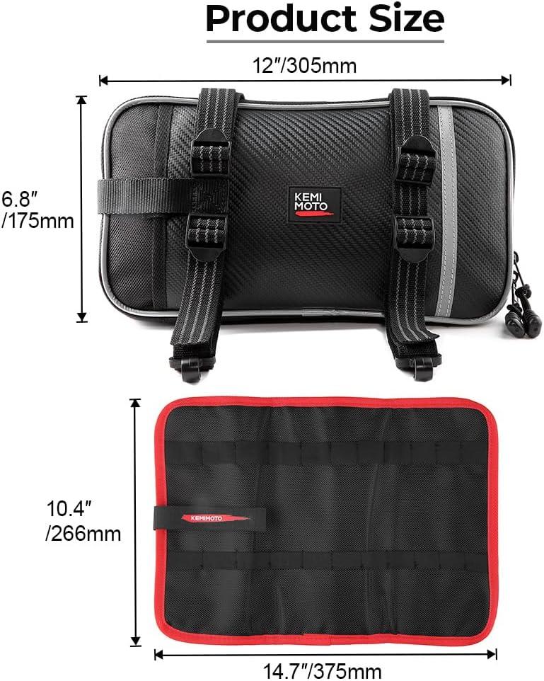 Roll Up Bag: Fender Bag Comes with a Roll up Tool Bag. The Motorcycle Fender Bag Has Three Fixed Straps and a Grid Layering. Its Excellent Storage Function Can Help Arrange Messy Small Items in an Orderly. These Items Will Remain in the Original Positions Even When Driving on Rough Roads
