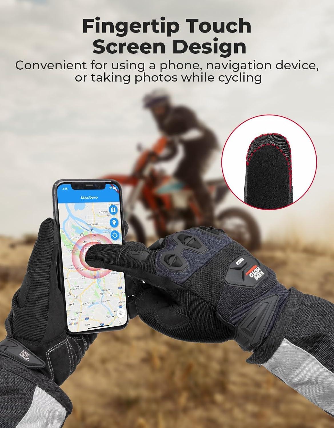 Sensitive Touch Screen: It works great with all touch screen devices in all weather conditions. It is comfortable to wear and allows for easy use of your phone. The motocross gloves feature a cotton palm pad design, making them feel cozy and soft.
