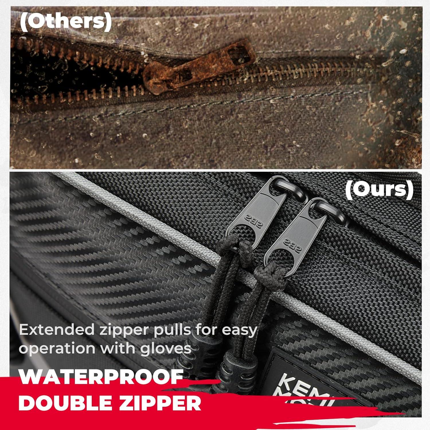 Waterproof Double Zipper: These lower door bags are designed with a double-ended waterproof zipper. Extended zipper pulls for easy operation with gloves. With 1680D water-resistant material, so mud and rain do not easily penetrate the bag
