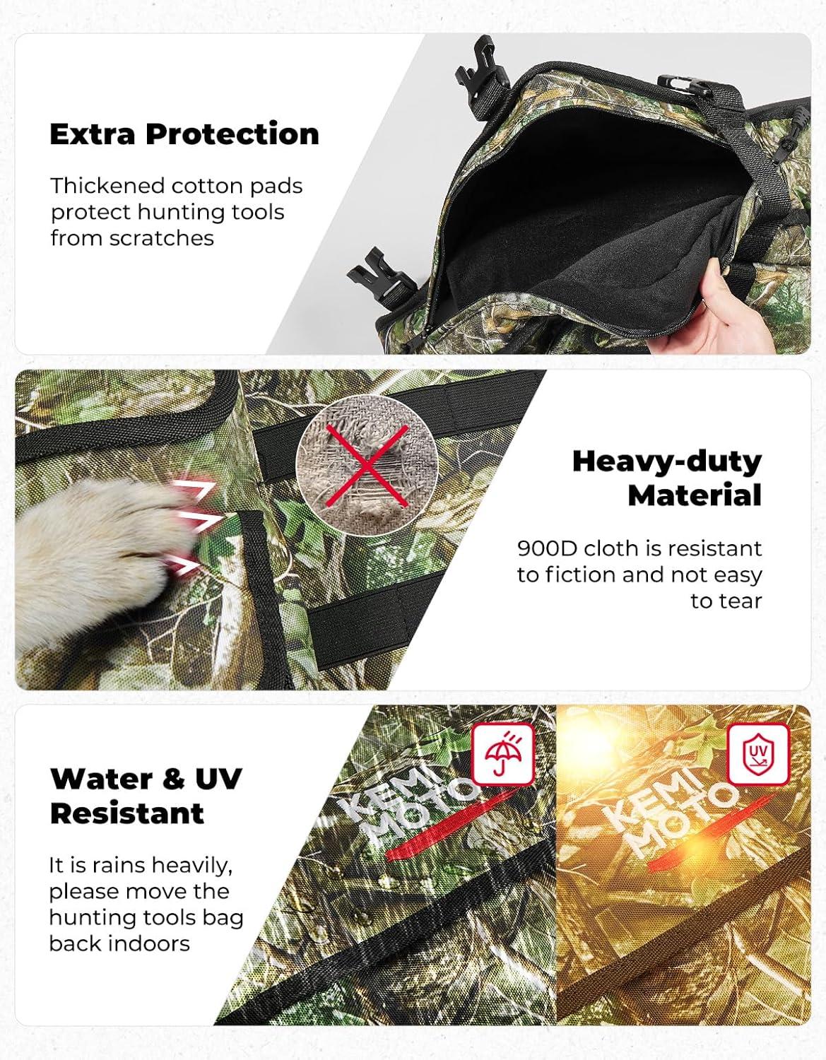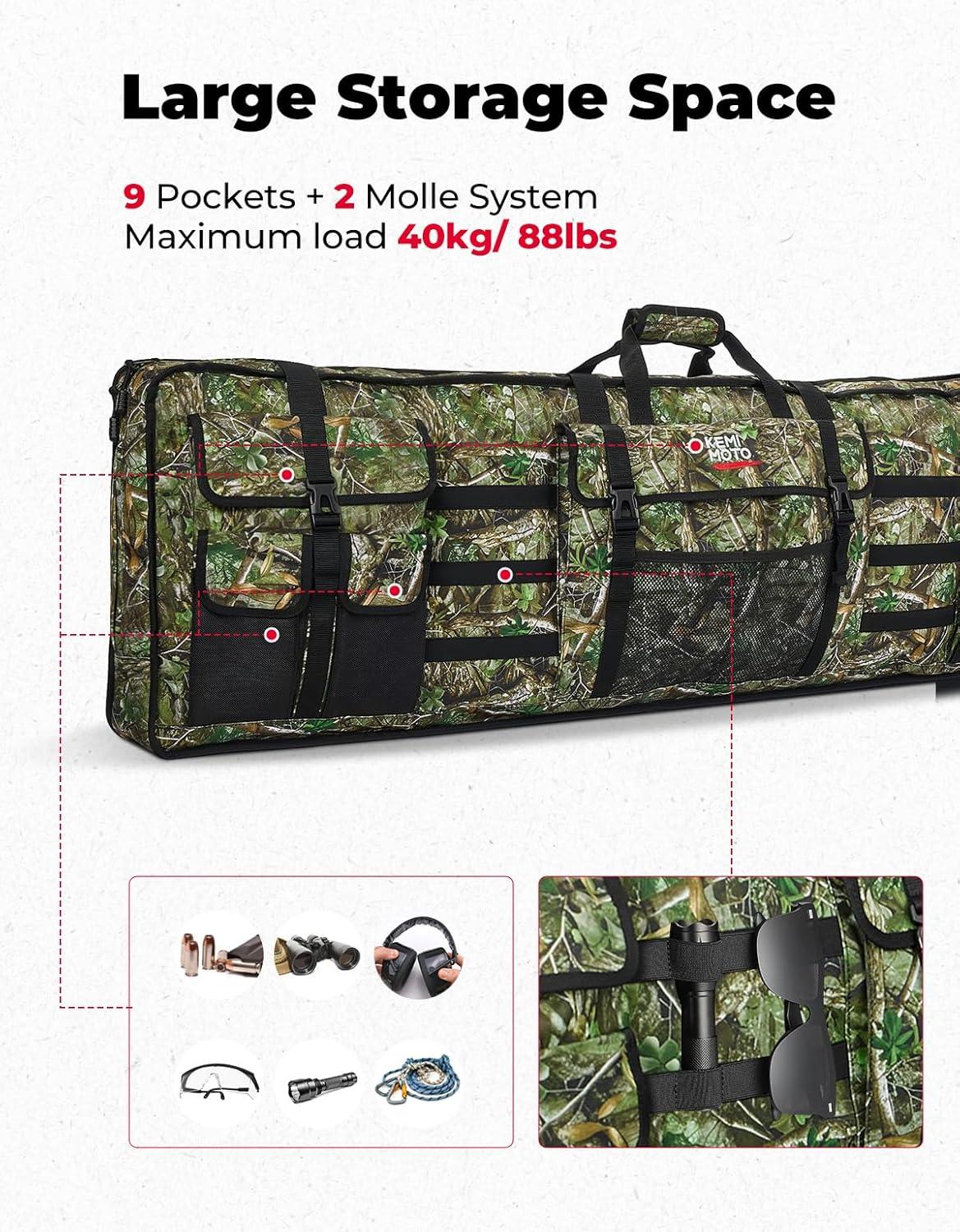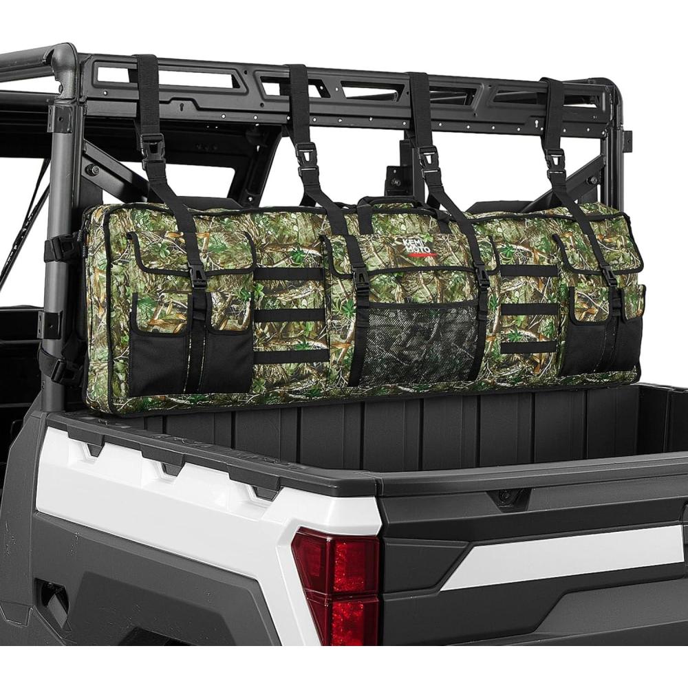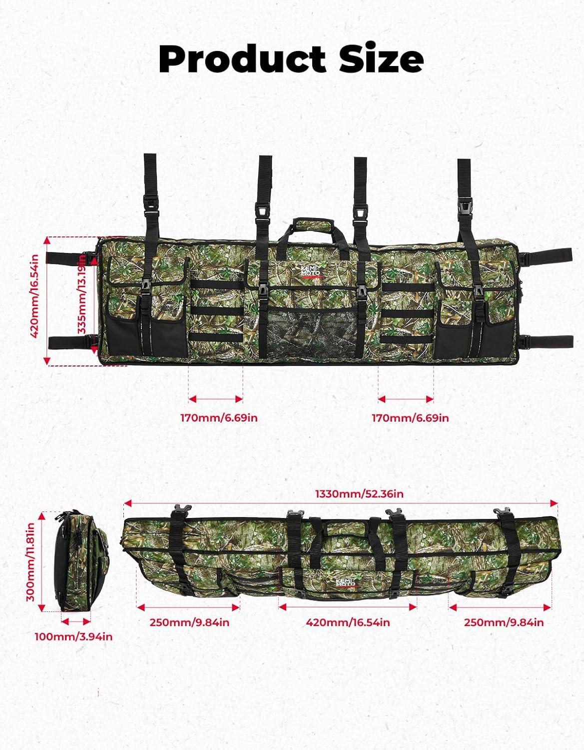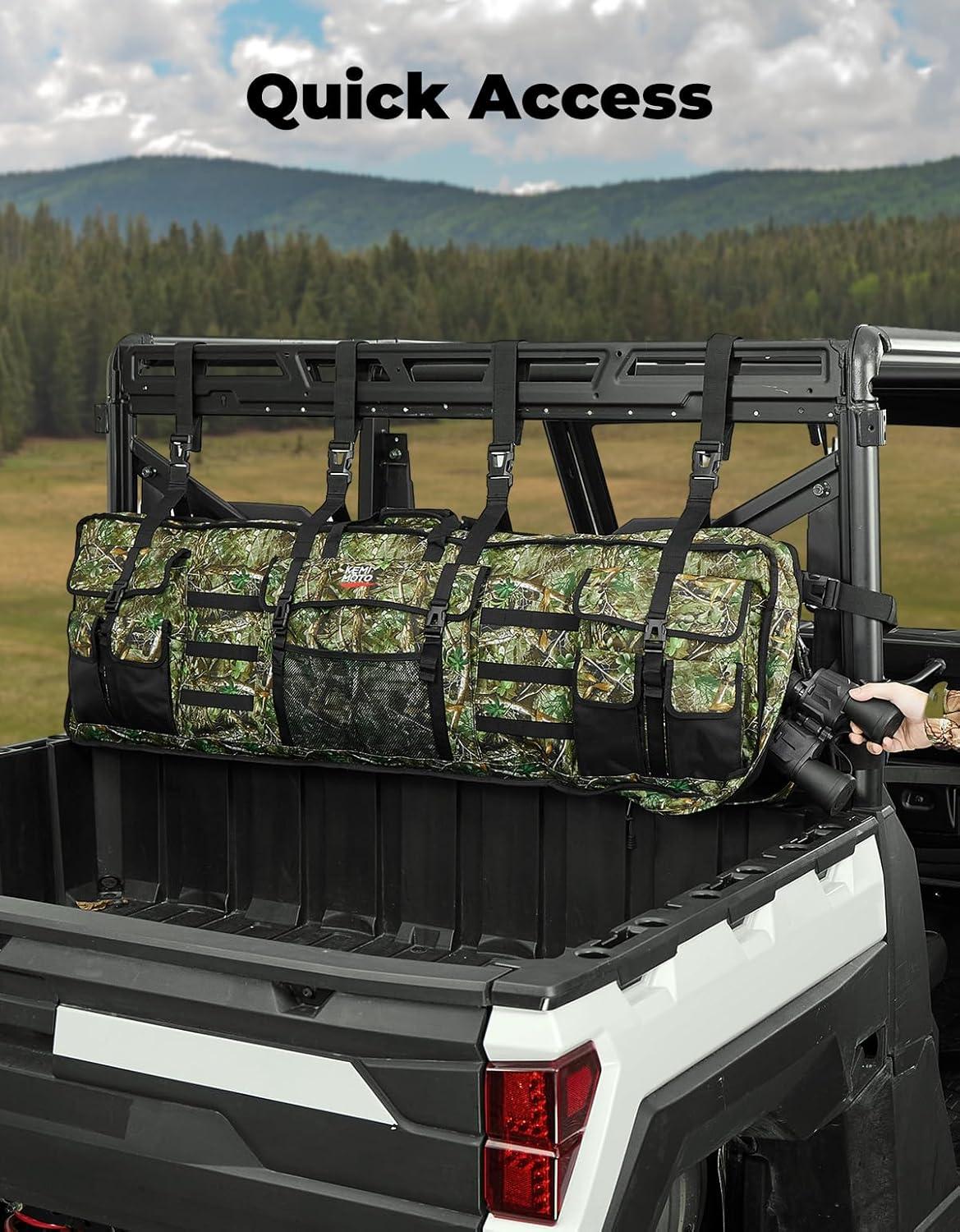 Large Storage: The UTV hunting tool rack bag is 52.4×16.5×3.9 inches and can hold one tool on each side, with additional storage pockets for hunting tools magazines, scopes, ear protection, and more