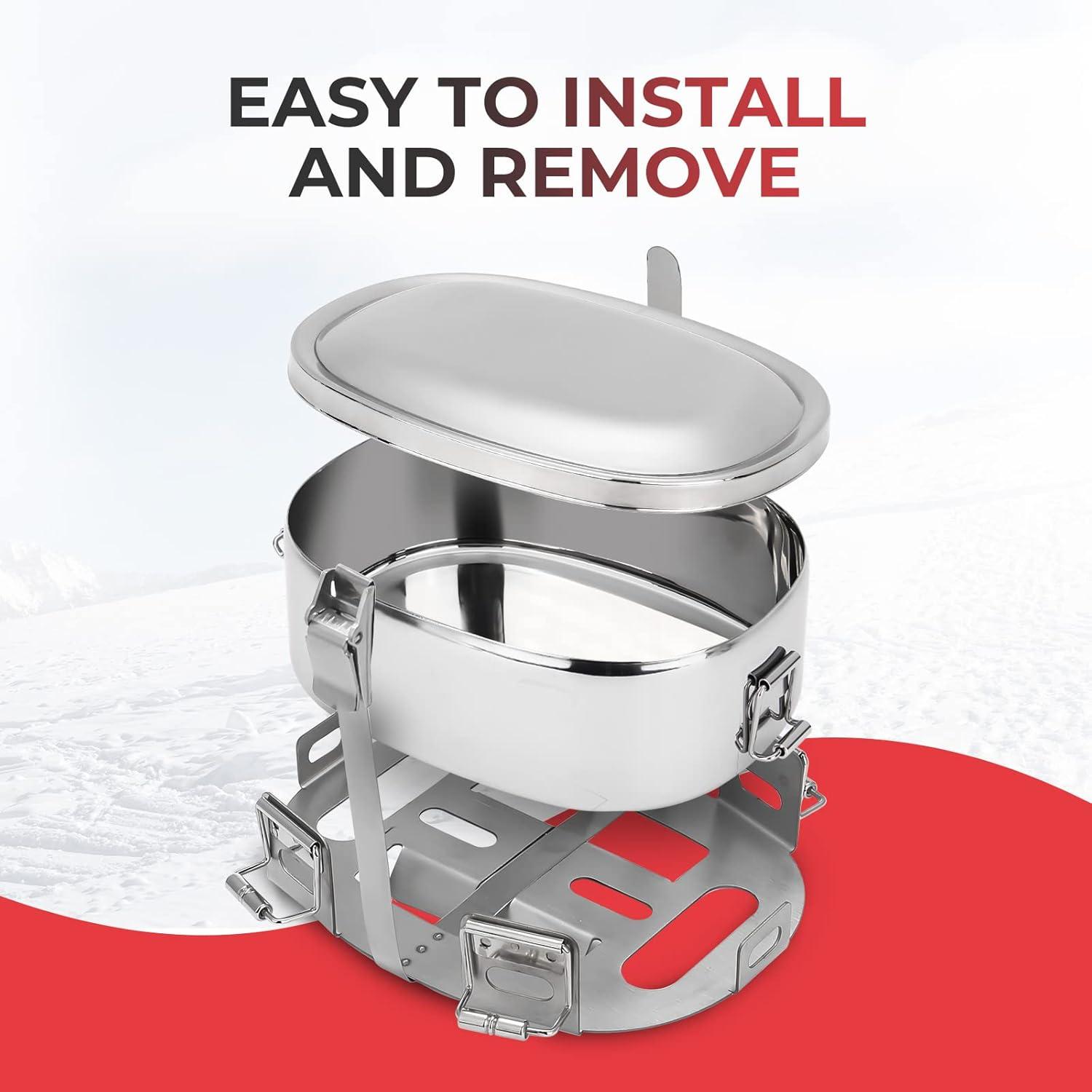 【Easy to install】 – Mount the heating base to your snowmobile's exhaust or muffler with the big hose clamp, then secure the pot with the 6 big clamps and one strap.You only need to spend 1 minute to get it easily.