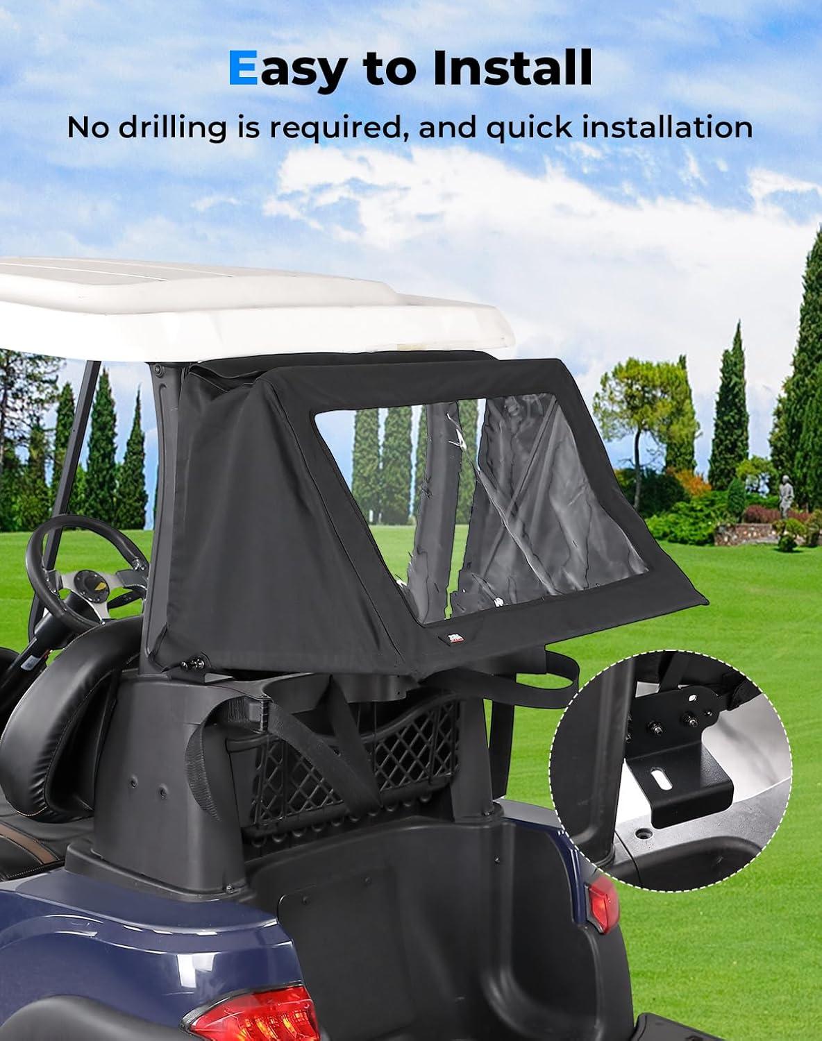 Easy to install: The golf cart rain cover was installed easily and quickly. No drilling and will not hurt your golf cart. There are accessories for golf cart models in the golf cart rear bag rain cover kit package