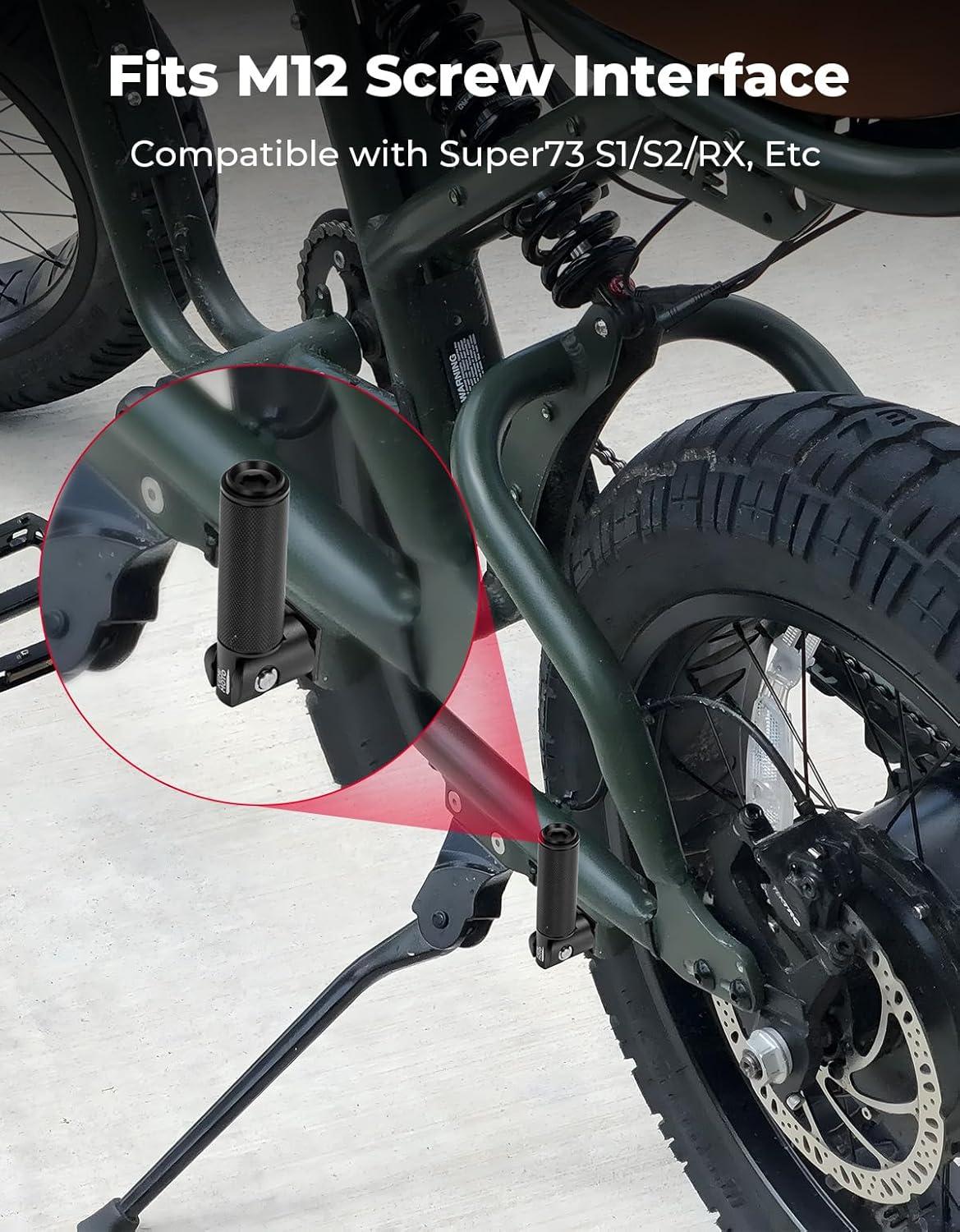 Easy Wide Fitment: Passenger Footpegs Compatible with ALL SERIES of Super73, Such As RX Mojave S2/ZX/R Adventure Series/RX Malibu etc. No drilling required for installation. Compatible with most bikes featuring M12 mounting holes, offering broad fitment and quick setup