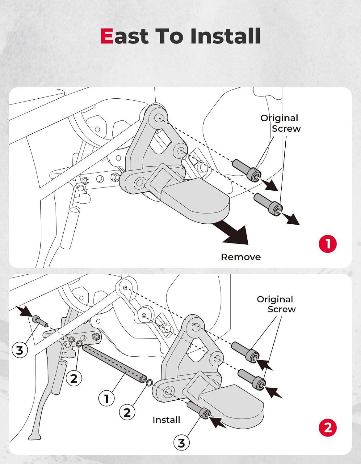 East to Install- No special tools except for the hex keys needed to remove a foot peg bracket, install the brace rod, and reinstall the foot peg bracket.