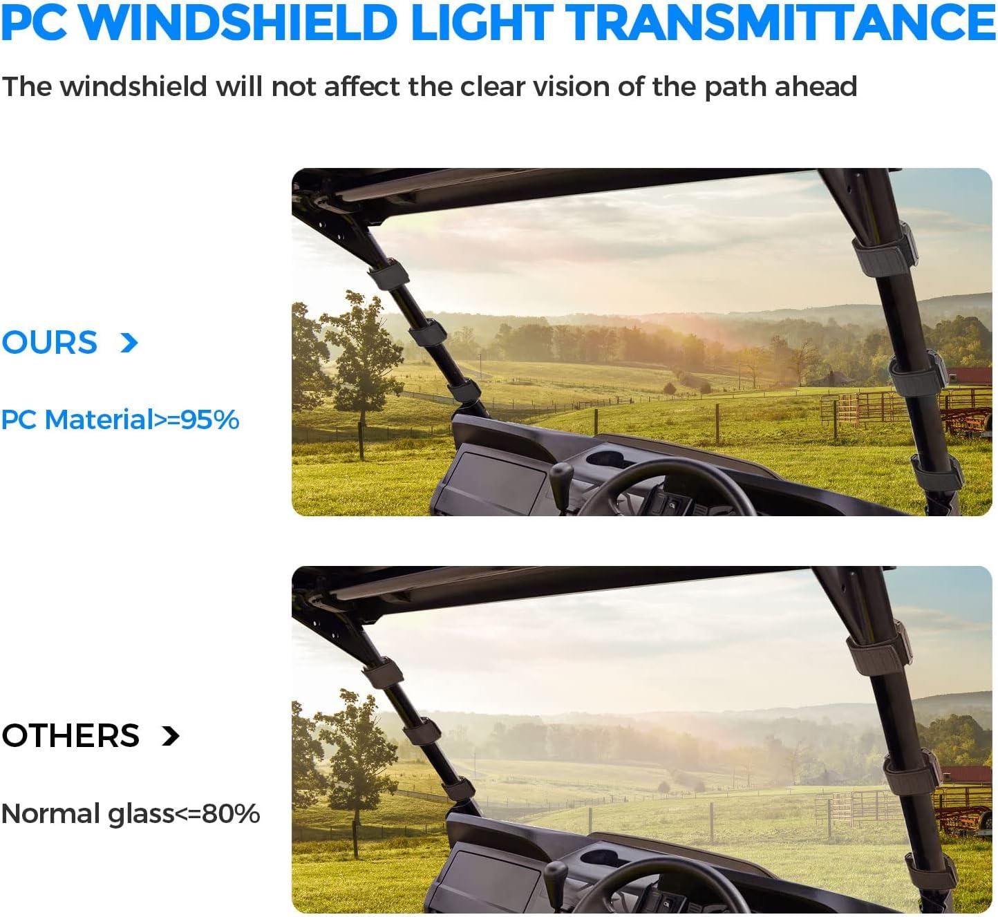 Clear Vision Through the Windshield: By using a PC in its construction instead of glass, KEMIMOTO windshield reduces our environmental impact while still providing you with excellent visibility while behind the wheel. This windshield material has a sheerness of over 95%