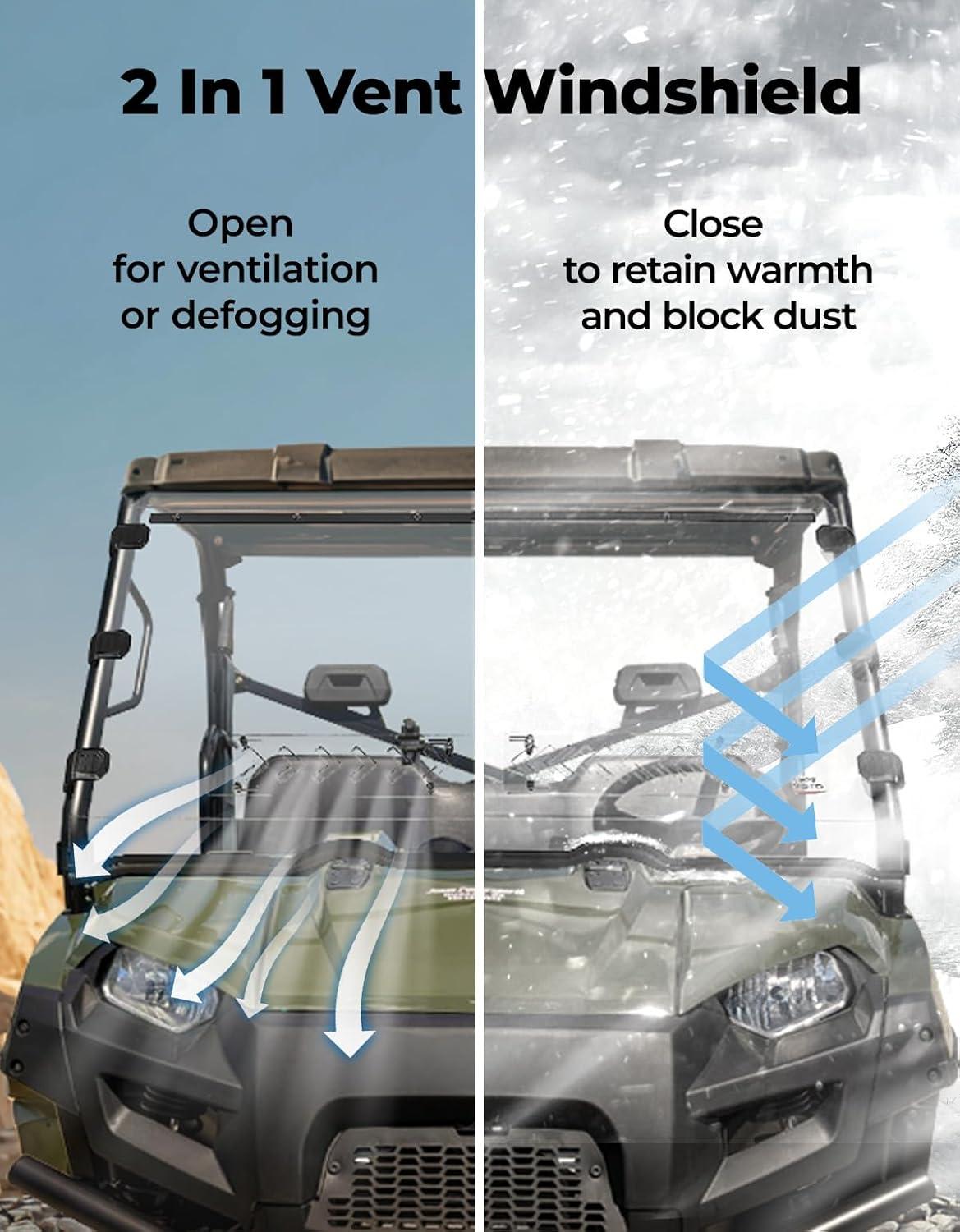Airflow & Defrost: The full size windshield features 2 sliding vents, combining full and half windshield benefits. Open them for better summer cooling and winter fog prevention, ensuring clear visibility. Close them to stay warm in cold weather