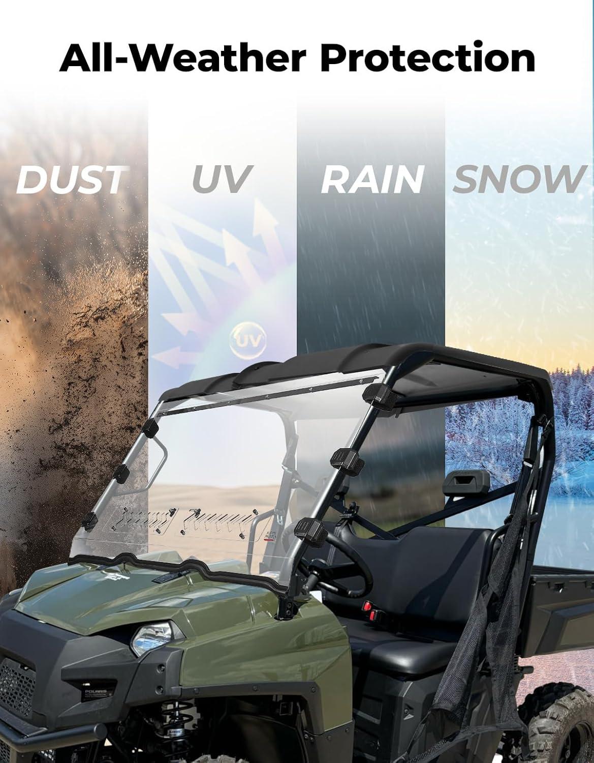 Compatibility: Fit roof, but not fit 570 Midsize Models. The vented front windshield is compatible with 2010-2014 Polaris Ranger 800 XP, 2010-2016 Ranger 800 6X6, 2010-2014 Ranger 800 XP Crew, 2016-2025 Ranger 570 Full Size(with Roll Bar), 2017-2025 Ranger 570-6 Full Size(with Roll Bar)