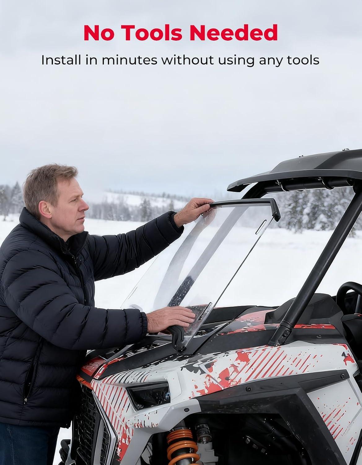 What You Can Get: One full windshield and four black clamps to keep you and your passenger safe, protecting against sticks and other flying debris while out on the trail. If you want to avoid the cold wind that can cause discomfort in winter, now is the time to invest in a KEMIMOTO UTV front windshield