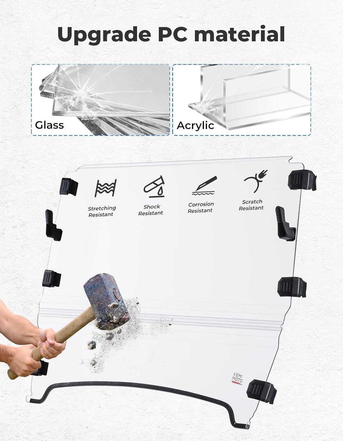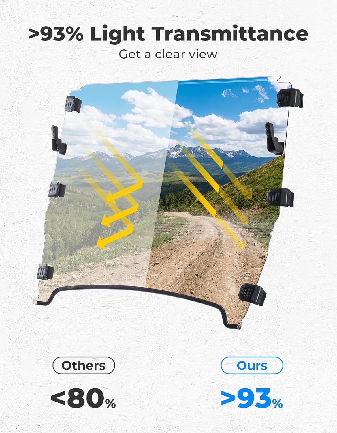High Transmittance: Constructed from 5mm PC material, KEMIMOTO front windshield delivers 93% light transmission while reducing glare. It resists stretching, shocks, corrosion, and scratches—making it easy to clean and highly durable. A clear view of the road ahead, plus protection from wind and rain