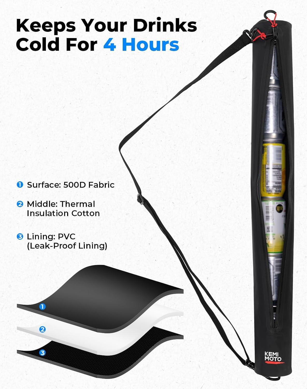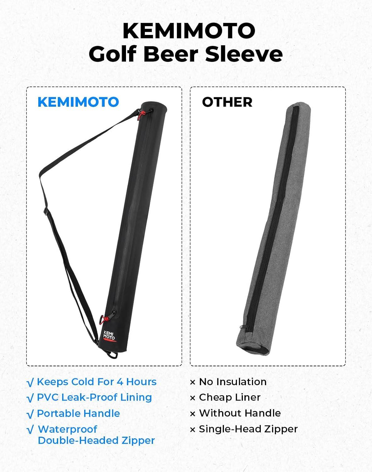 Keep Cold 4 Hours and Waterproof: The KEMIMOTO Beer Sleeve features great insulation and a durable PVC lining, ensuring your drinks stay cold four hours on the golf course. Made from tough 500D fabric, the golf beer bag is both waterproof and easy to clean. Enjoy long-lasting performance without worrying about seam tears