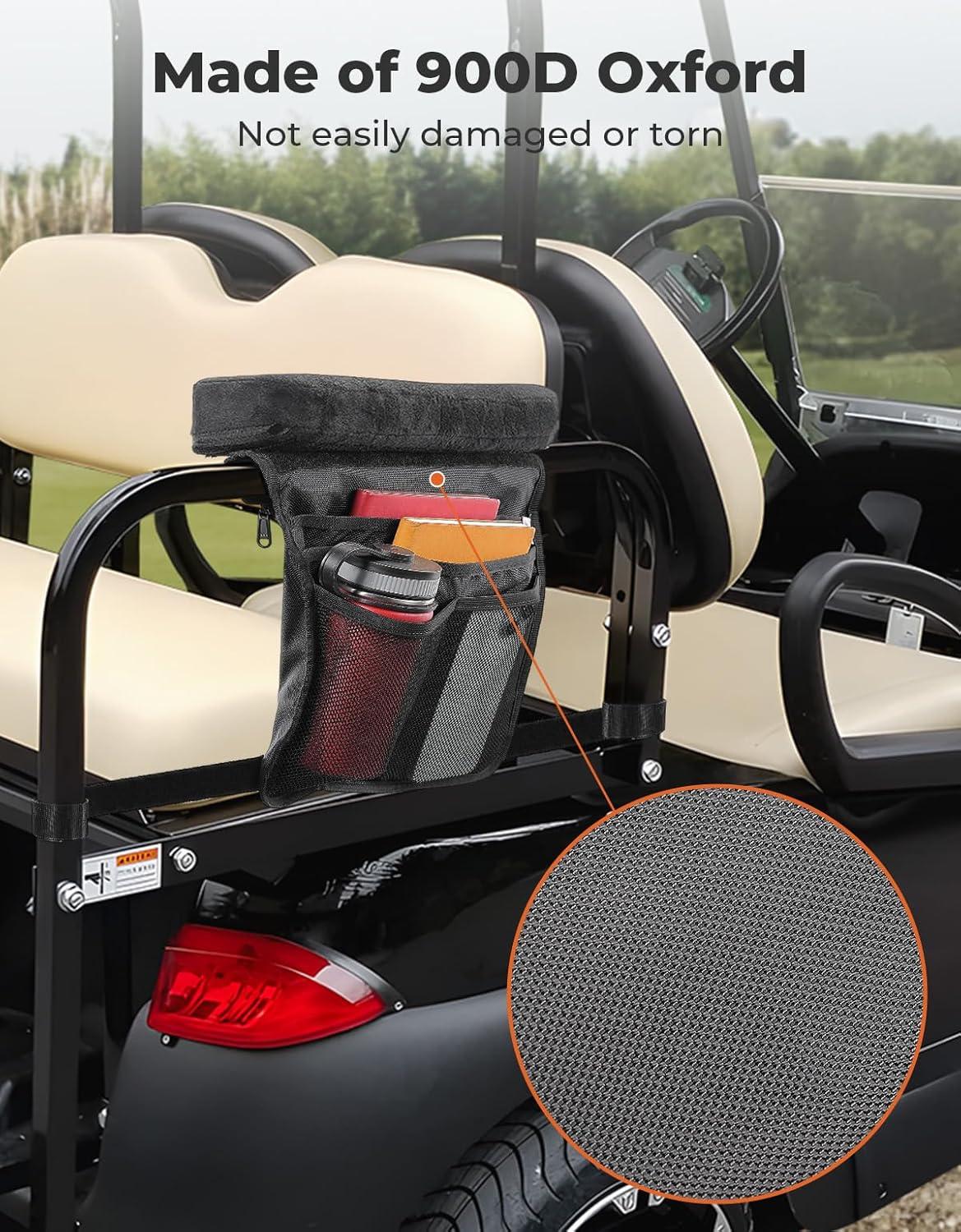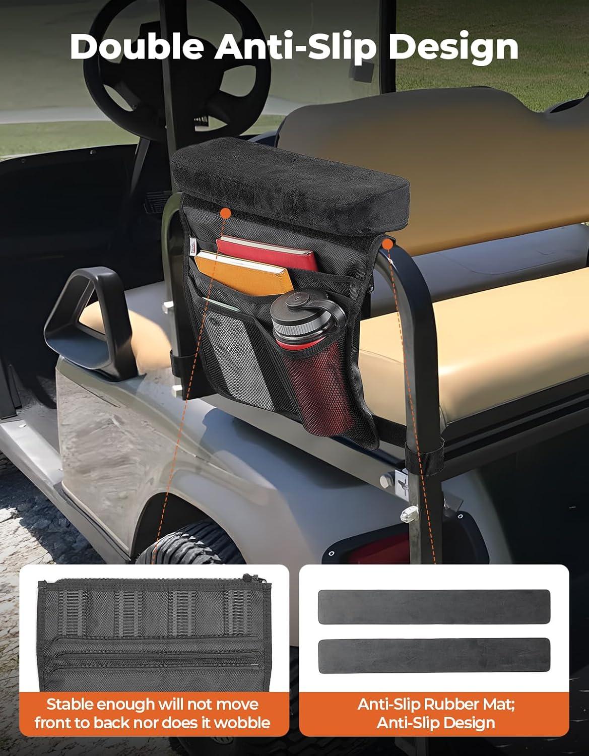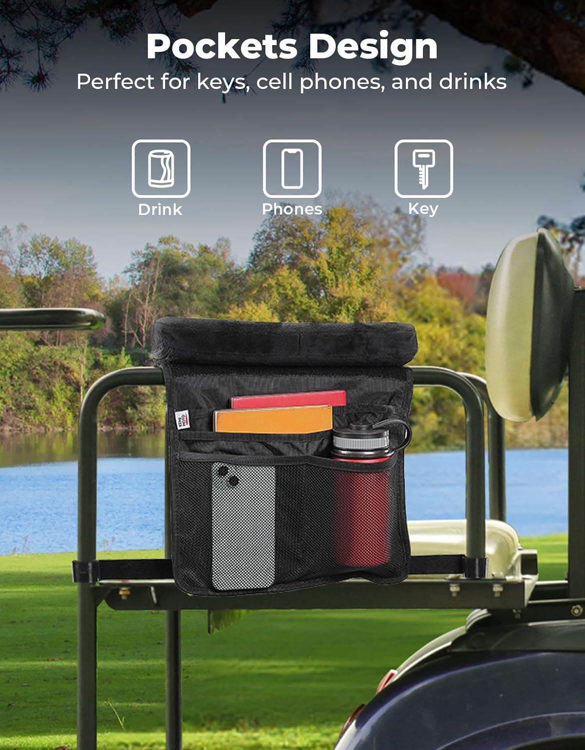 Practical Storage Space: Four storage spaces, two-layer pockets, and two mesh pockets (can be used as cup holders). It is good for everyday stuff like gloves, keys, cell phones, and water bottles. Say goodbye to the embarrassment of putting drinks on your lap. The golf cart armrest with cup holder will add a great deal of comfort for those sitting in the rear seat of your golf cart