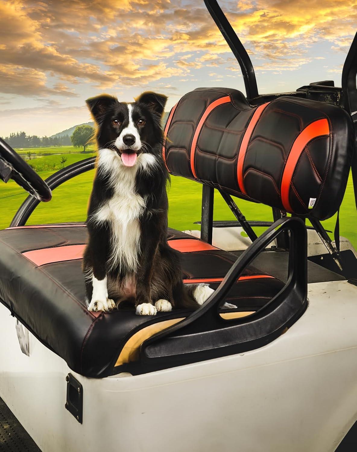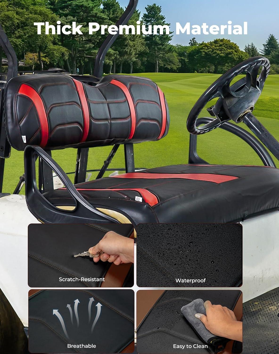Premium Upgraded Materials: Crafted from heavy-duty PU leather, our seat covers offer a soft, warm texture with excellent breathability. The thickened golf cart seat cushions feature exquisite stitching and are both waterproof and UV-resistant. Compared to ordinary fabric materials, our seat covers not only give your golf cart a fresh new look but also ensure a significantly longer lifespan