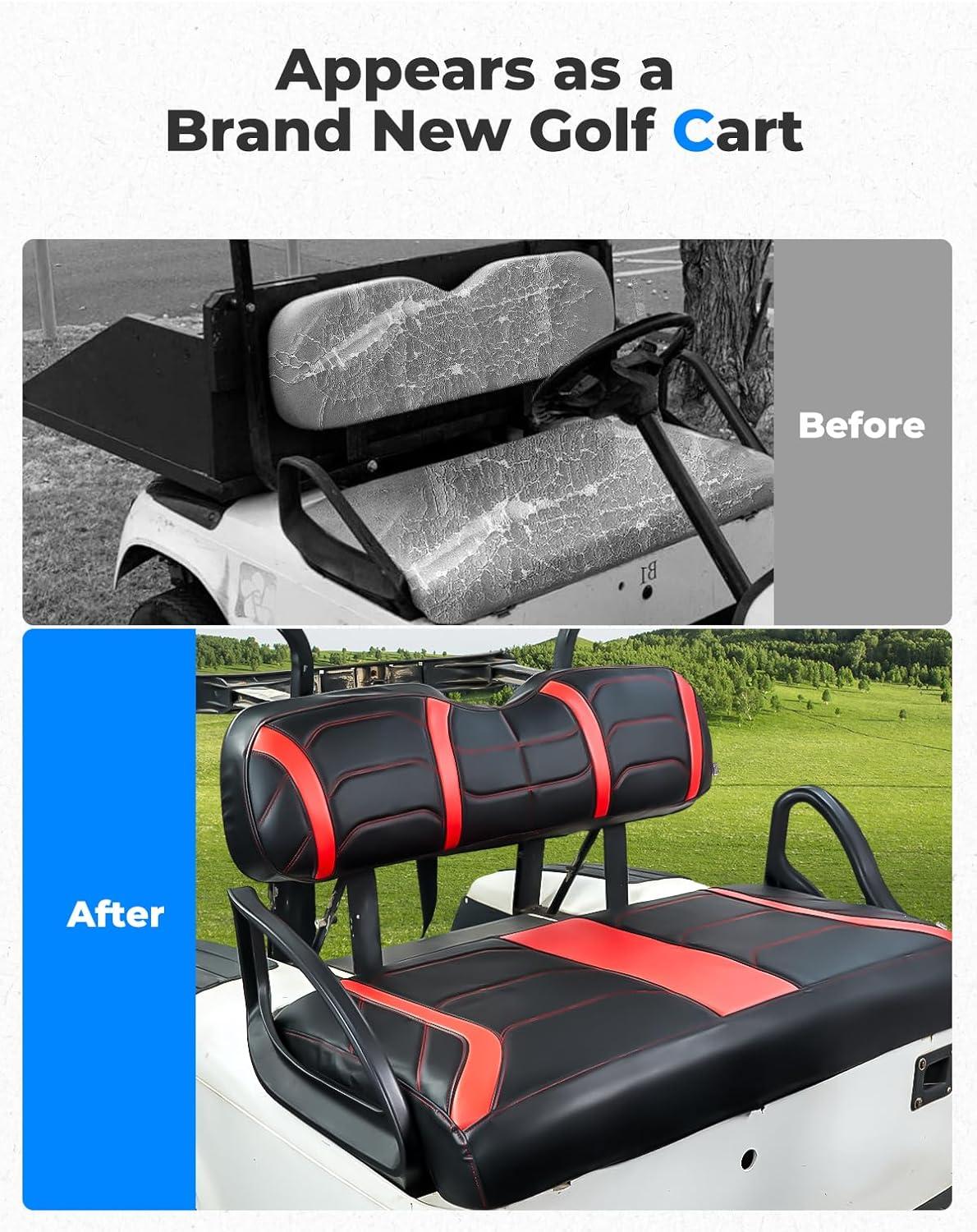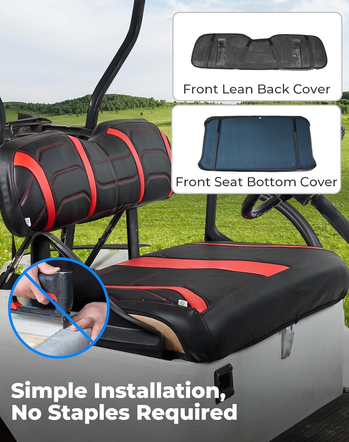 Easy to Install: No need for staples, no damage to the OEM golf cart seat. Both the front backrest and seat are equipped adjustable with magic tape straps, just put the new seat cover on the existing one in a few minutes