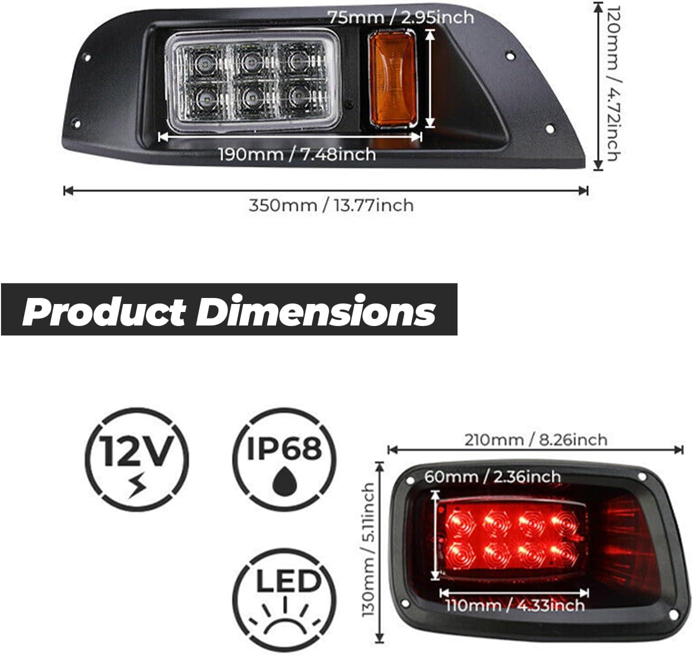 WaterProof and Dustproof:The golf cart light kits are waterproof and dustproof. All components are sealed with silicone, preventing water from entering and burning out the bulbs. The LED lights consume less energy and save battery life so you can drive farther on a single charge