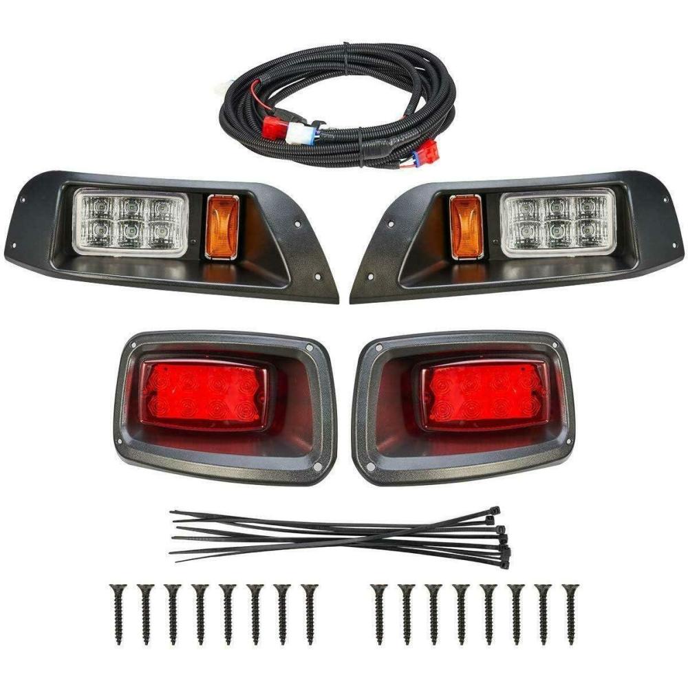 Package Included:The package includes automotive-style adjustable LED lights for EZGO TXT golf carts that can be aimed with the turn of a screw, along with improved wiring connectors. It contains 2 LED headlights (left & right), 2 LED taillights (left & right), 1 switch, a wiring harness, a cutting template, installation instructions, and hardware