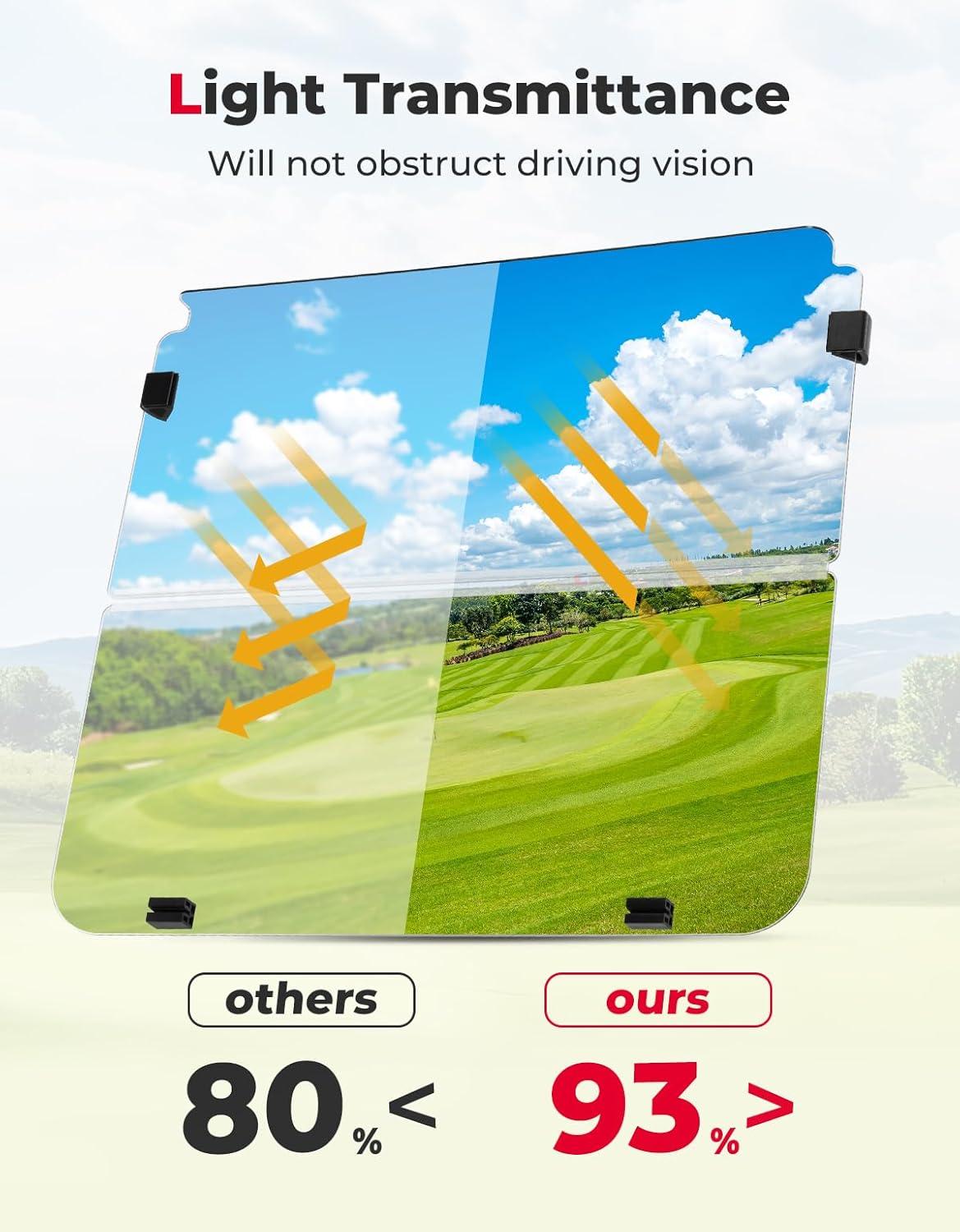 Clear Visibility: With a light transmittance of 93%, this golf cart windshield provides a clear and undistorted view, featuring anti-glare and UV protection