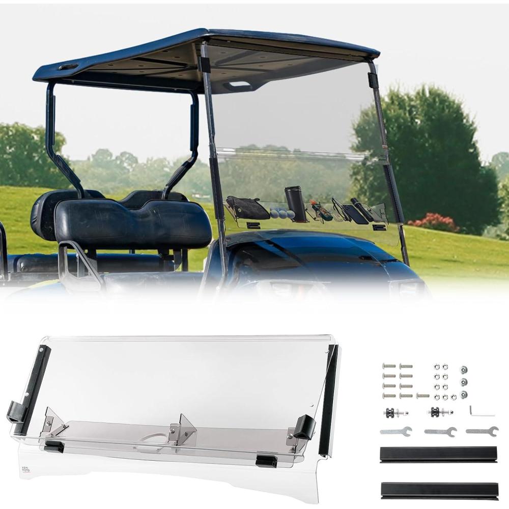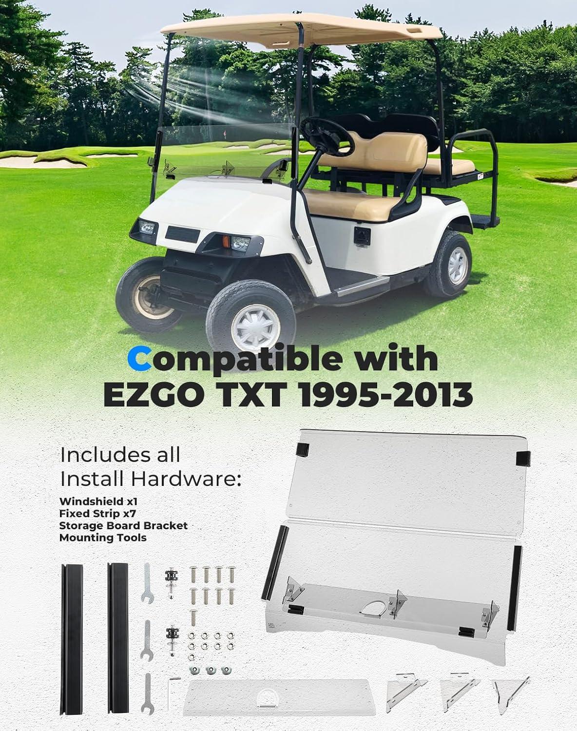 Compatibility: Patent-designed 2-in-1 storage golf cart windshield, designed to be Compatible with EZGO TXT models from 1995 to 2013, seamlessly aligning with the frame. KEMIMOTO golf cart windshield available in clear and tinted options.