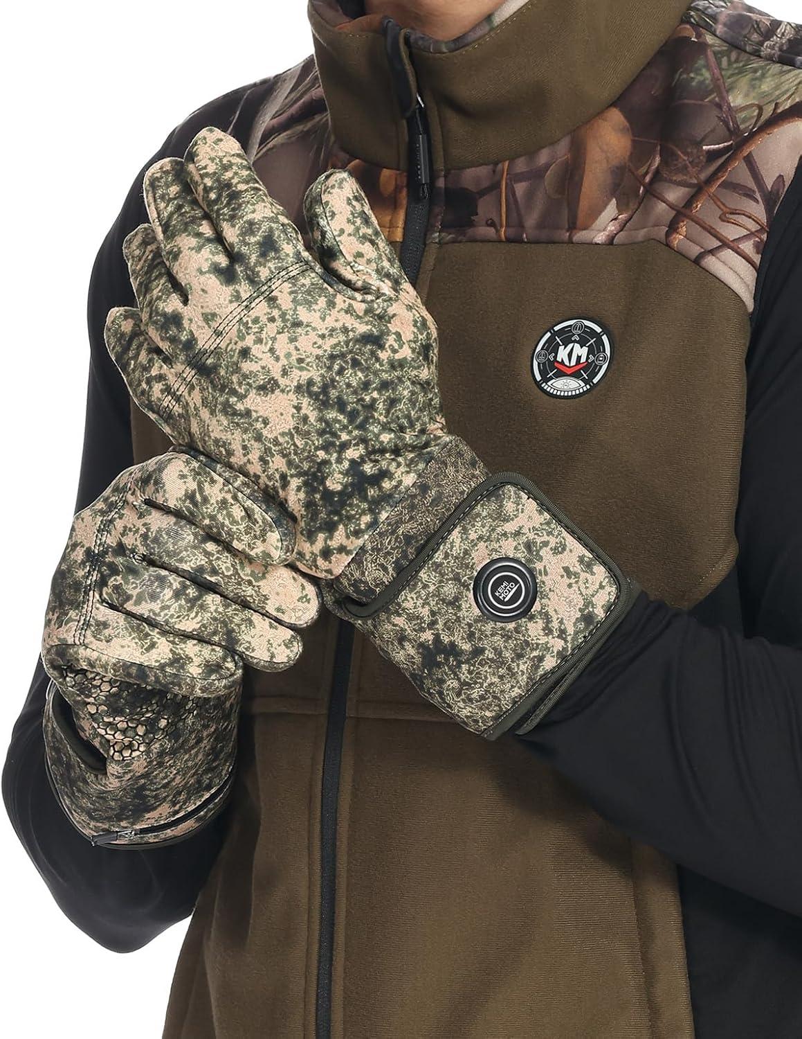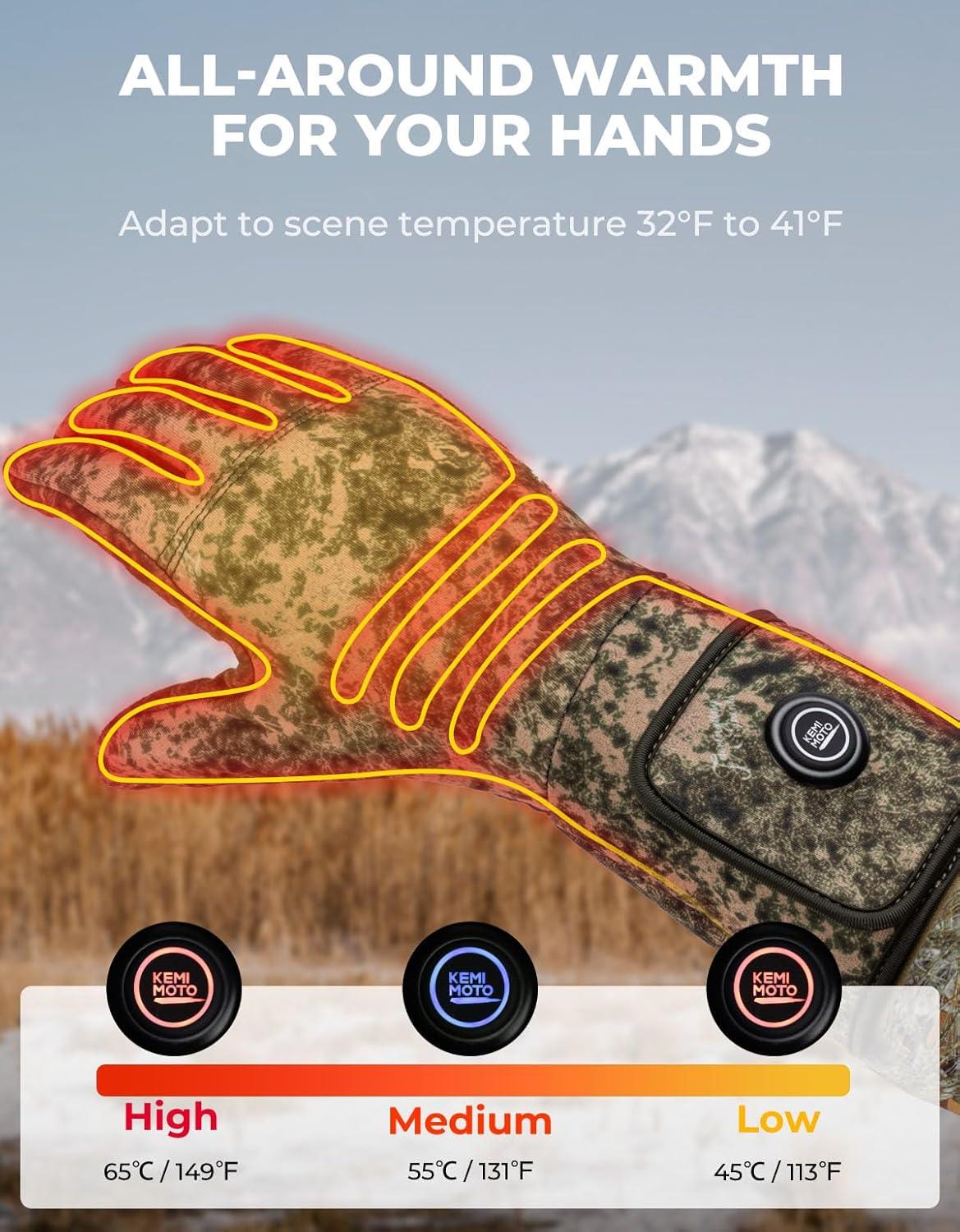 Thermal Liner Gloves: KEMIMOTO Thin Heated Gloves feature a velvet lining and are suitable for temperatures from 32°F to 41°F. They can also be worn as liner gloves to enhance cold protection, keeping you and your family warm during colder months. These heated hunting gloves include multiple heating zones that cover the fingers and the back of the hands
