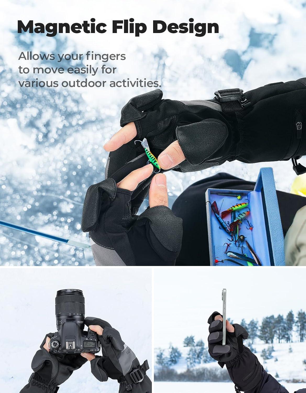 Water-resistant and Windproof: Heated winter gloves have water-resistant, temperature-retaining layers, with only the flip finger sections being non-waterproof. The day knot and spring drawstring closure prevent air seepage, providing double the warmth