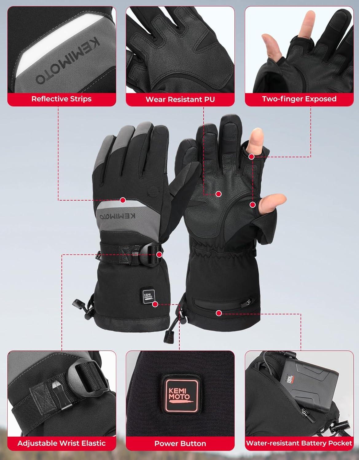 KEMIMOTO Heated Gloves Winter, Heating Motorcycle Gloves for Women Men with Flip Magnetic, Electric Rechargeable Battery 2pcs 7.4V, Touchscreen Water-Resistant for Fishing, Skiing, Hunting(X-Large)
