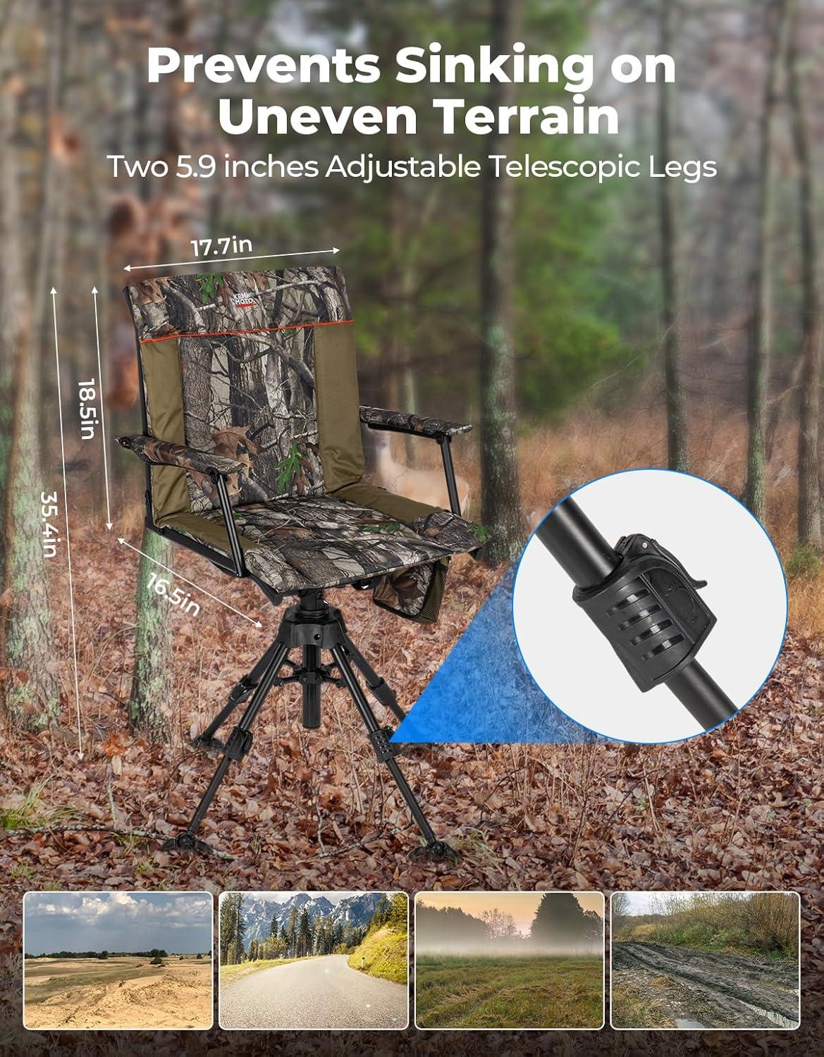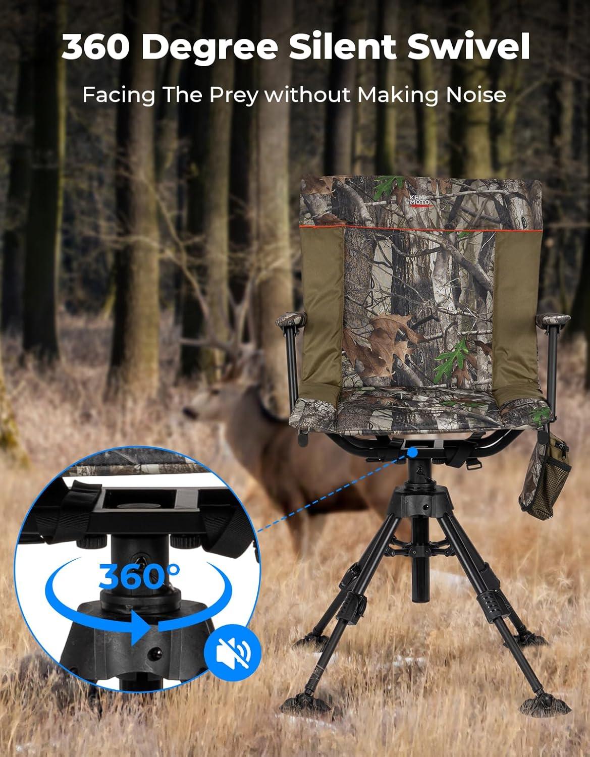 360 Degree Silent Rotation: The KEMIMOTO full 360 degree hunting chairs that swivel features a noise-reducing design. Tips: Tighten the screws securely during installation and use tools if necessary to prevent loosening and noise. You can spin and shoot game quickly without making a sound! Perfect for hunting deer duck, camping, fishing or other outdoor sports