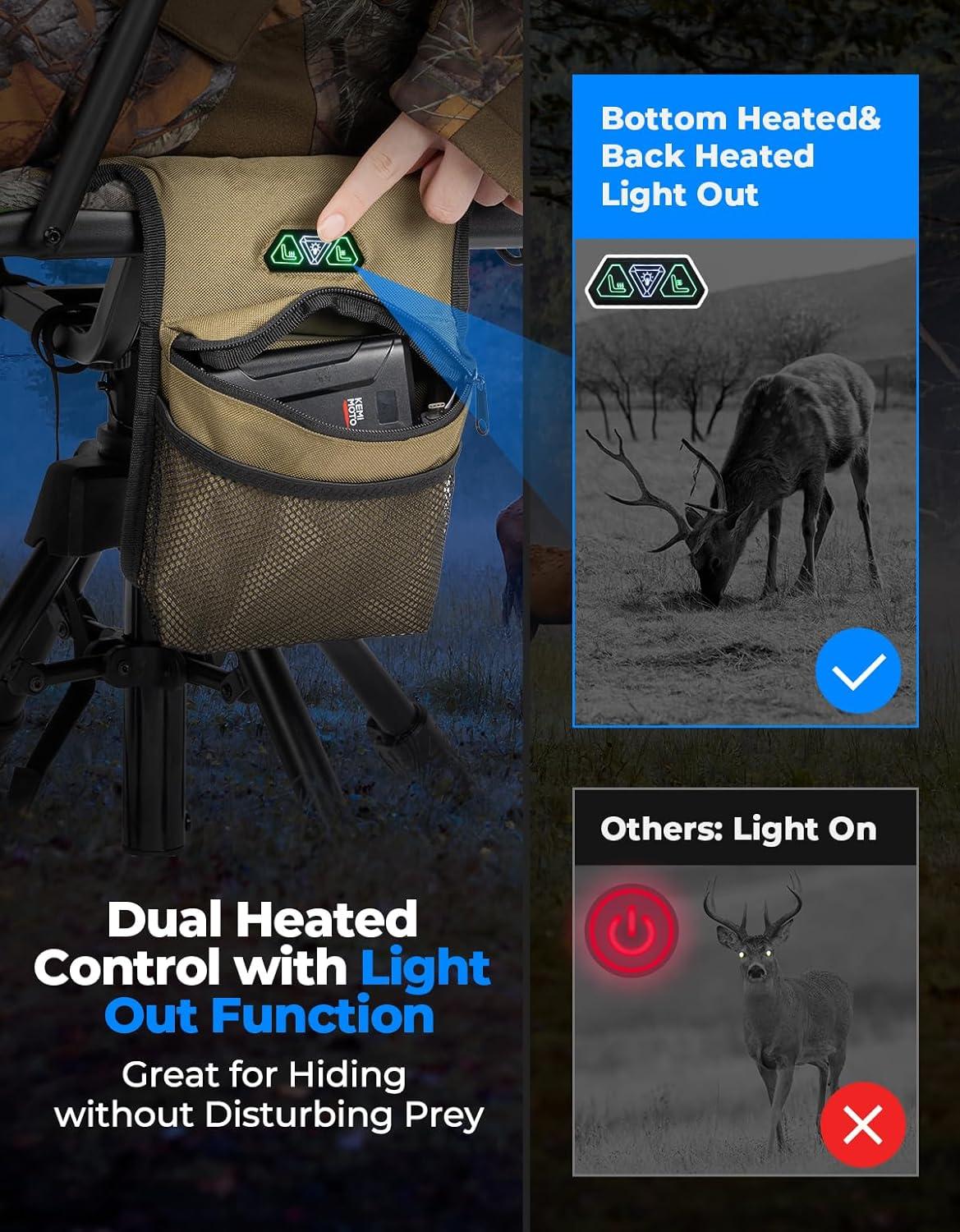Light Out Function: Great for hiding without disturbing prey and people with low-key behavior. The light out button is in the middle of the chair switch and still heats up when light is out