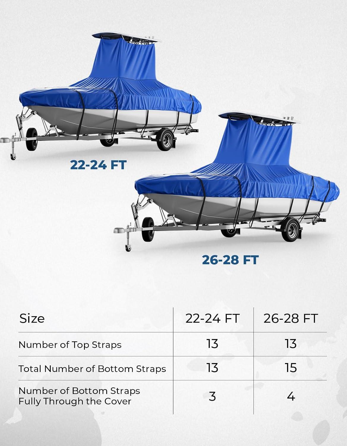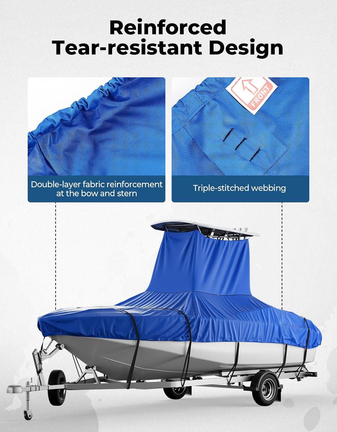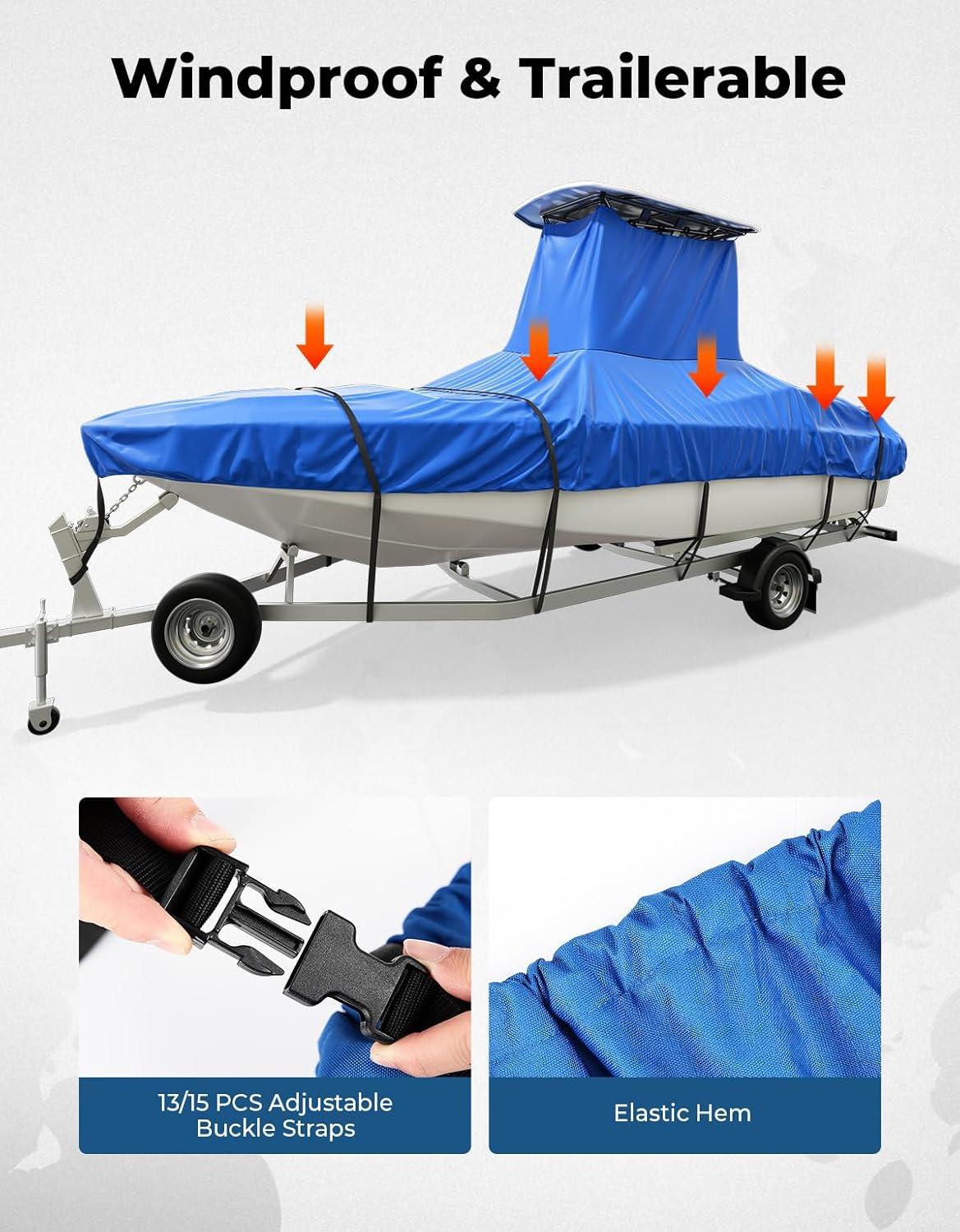 Windproof & Trailerable Design: Ideal for towing, this T TOP boat cover comes with windproof buckles and straps, including 13 top straps, 15 bottom straps, an elastic hem, and 4 cross-body straps. These features ensure that the cover remains secure even in high winds