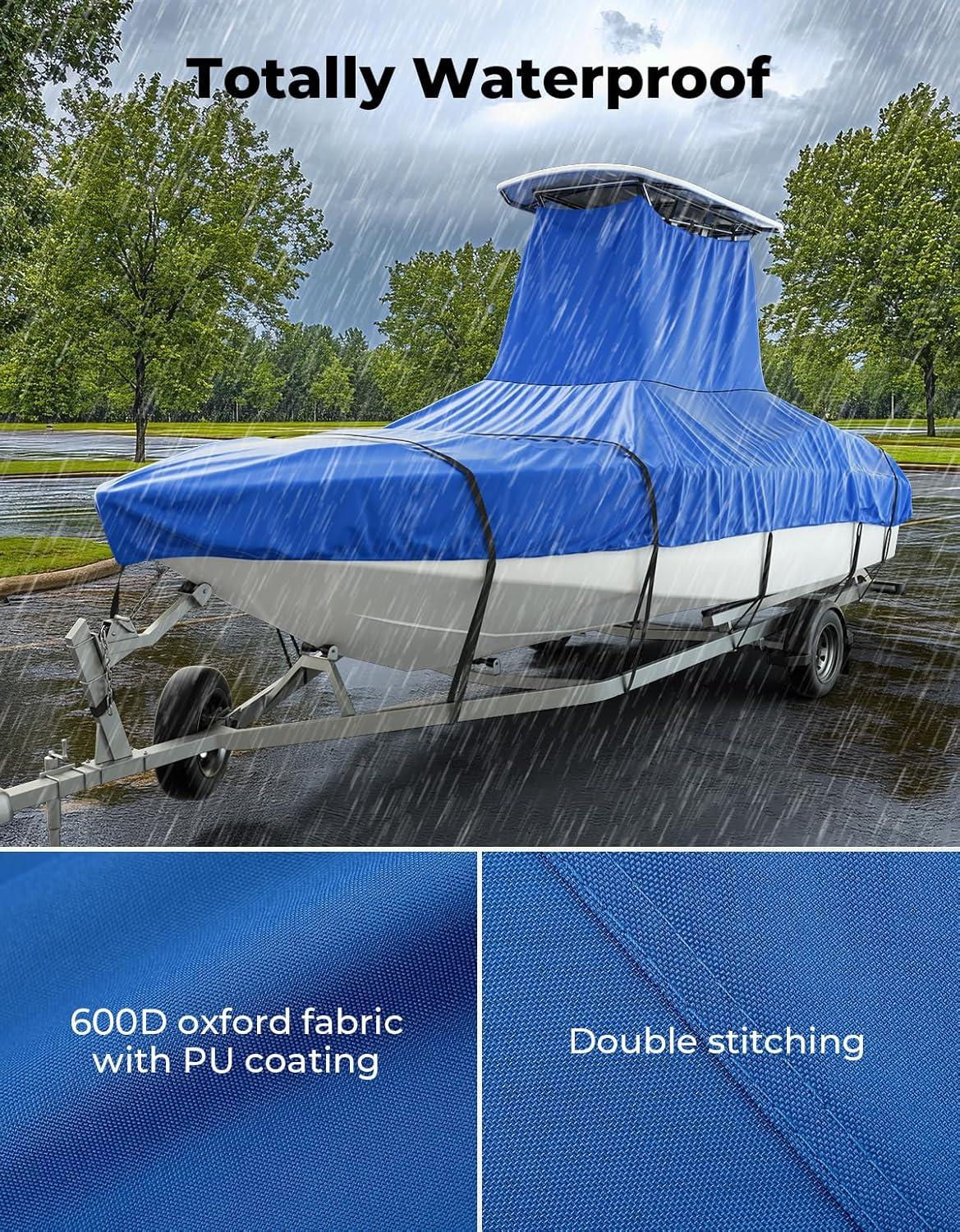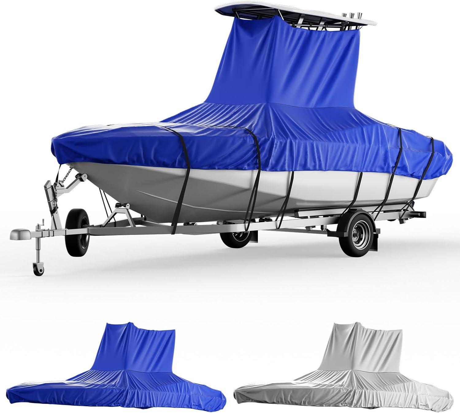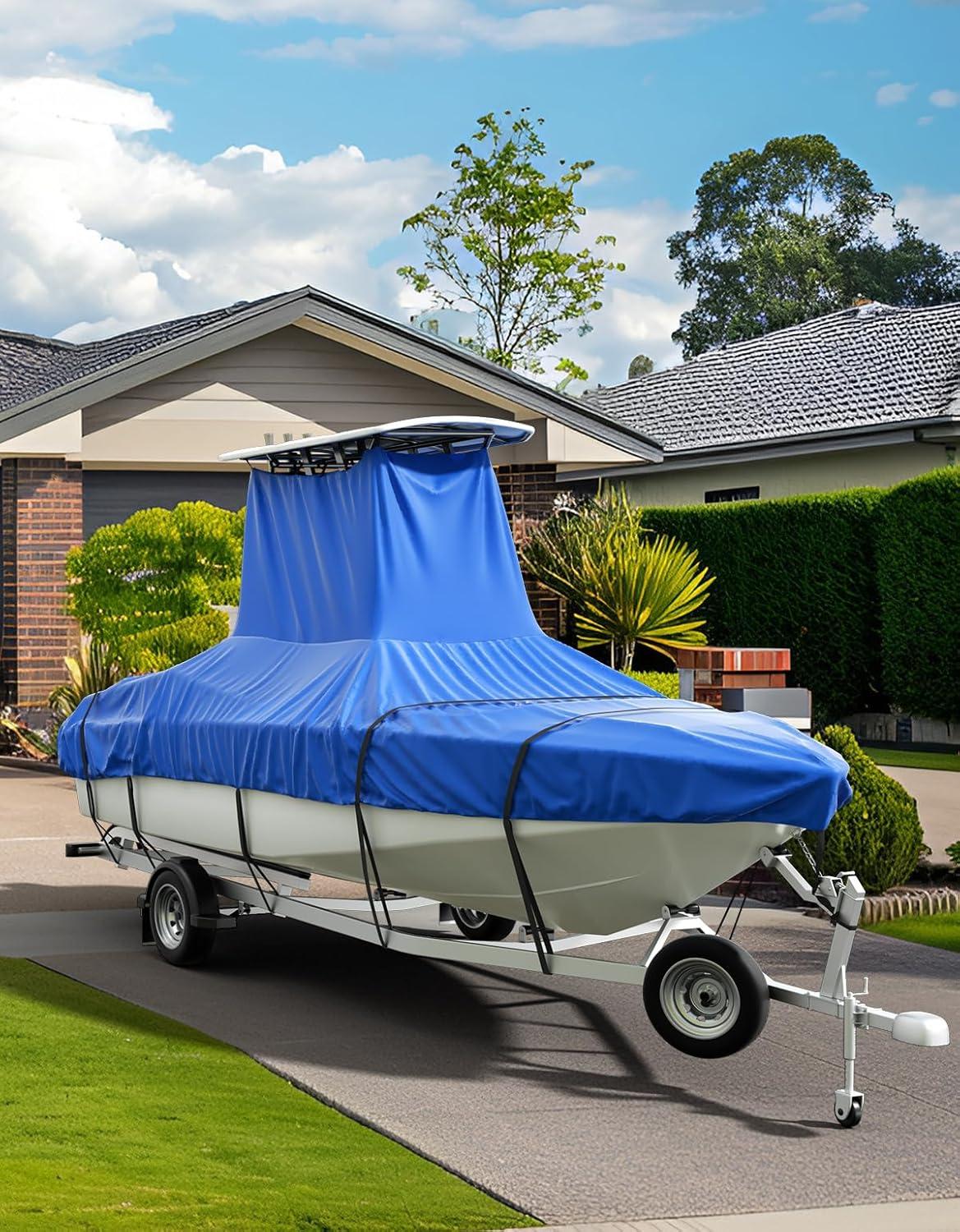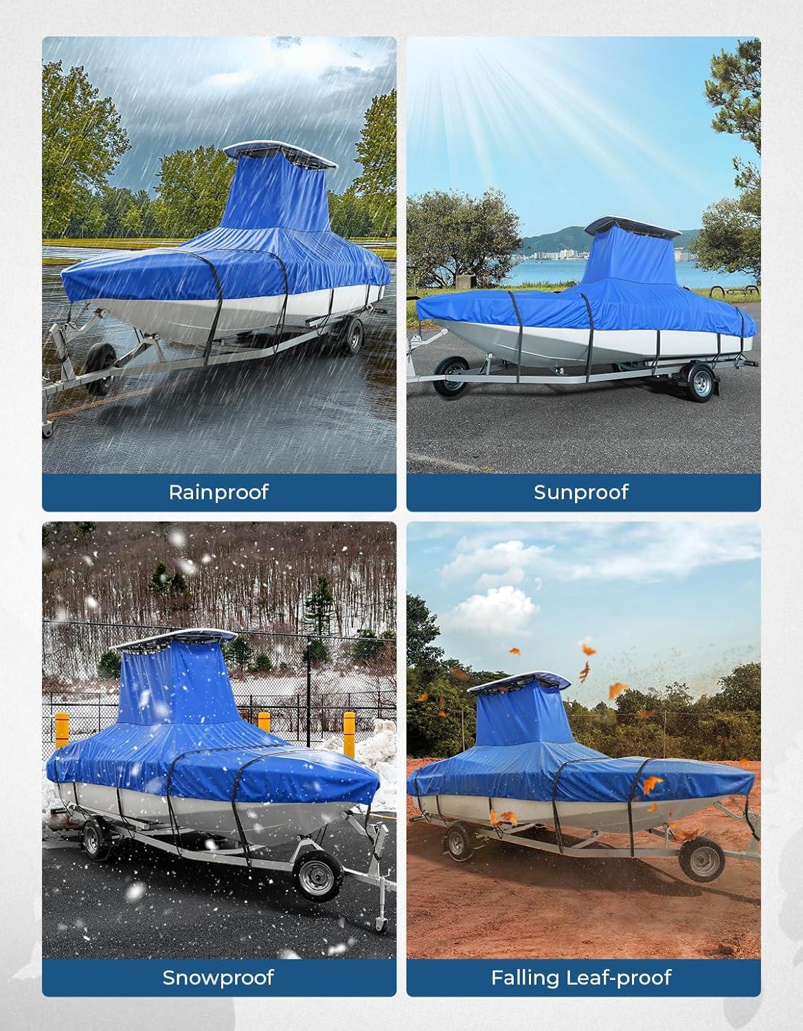 Windproof & Trailerable Design: Ideal for towing, this T TOP boat cover comes with windproof buckles and straps, including 13 top straps, 15 bottom straps, an elastic hem, and 4 cross-body straps. These features ensure that the cover remains secure even in high winds