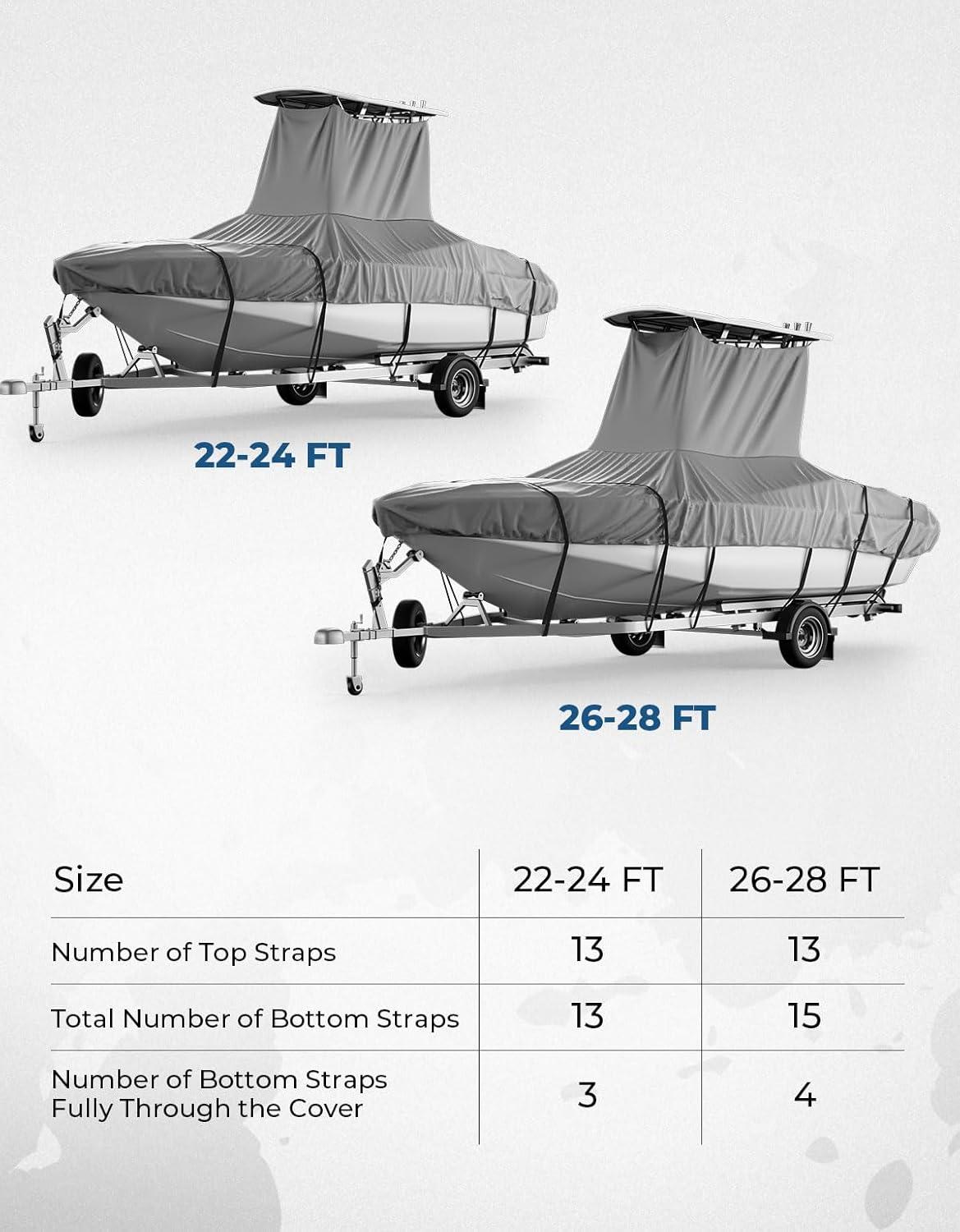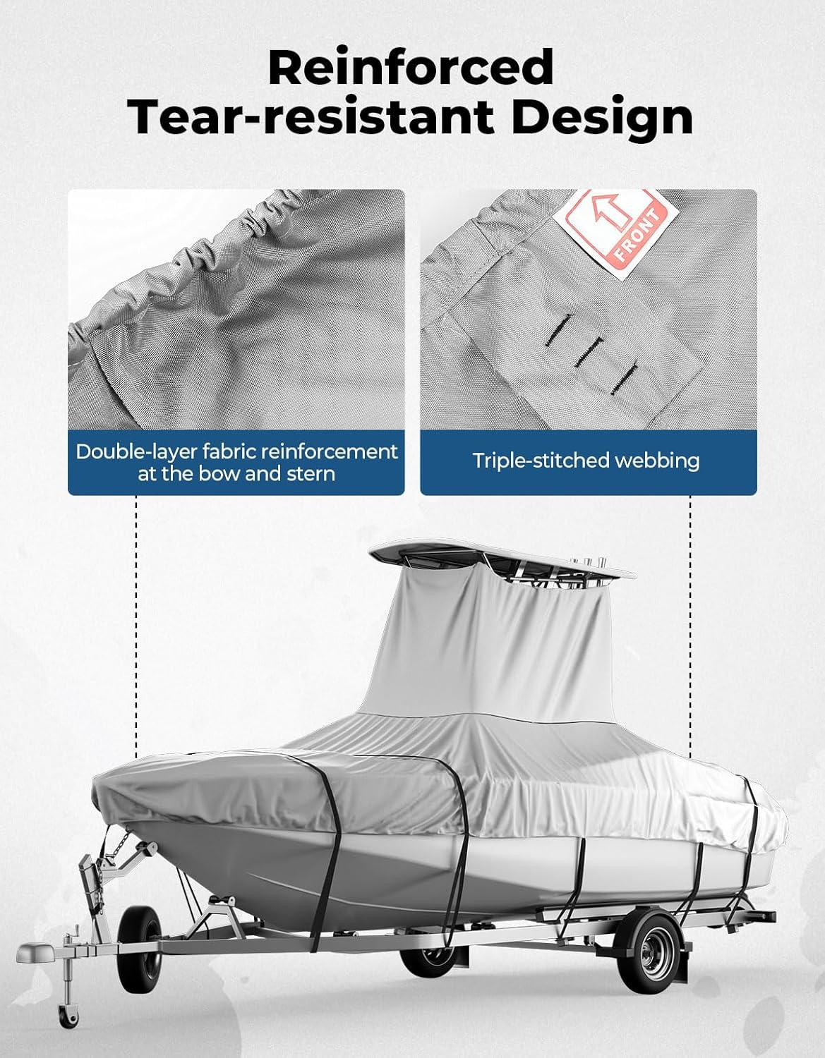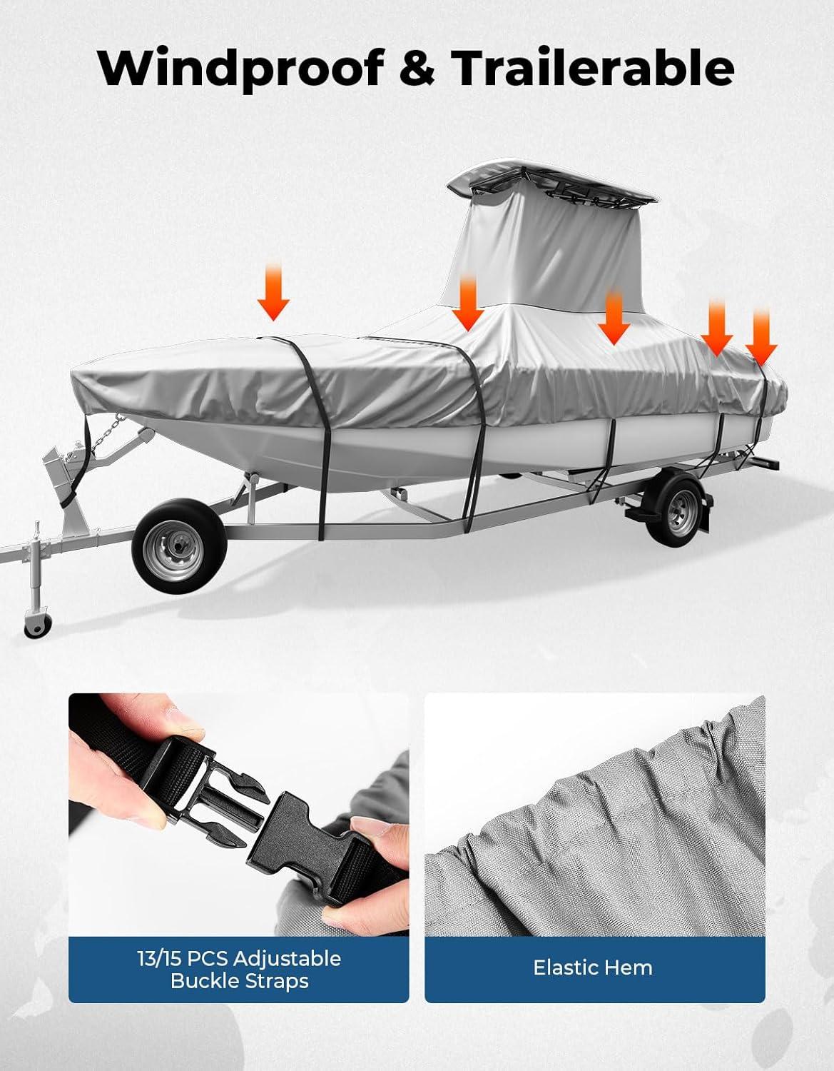 Windproof & Trailerable Design: Ideal for towing, this T TOP boat cover comes with windproof buckles and straps, including 13 top straps, 15 bottom straps, an elastic hem, and 4 cross-body straps. These features ensure that the cover remains secure even in high winds