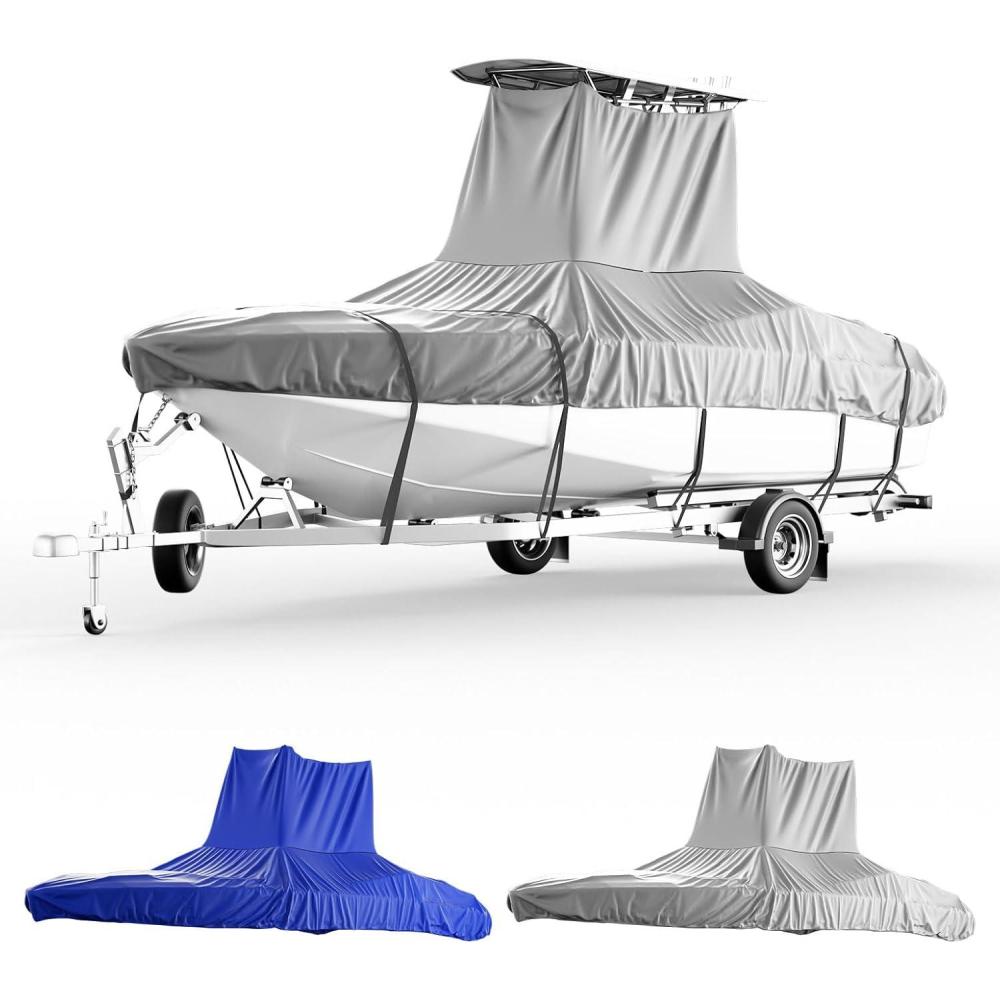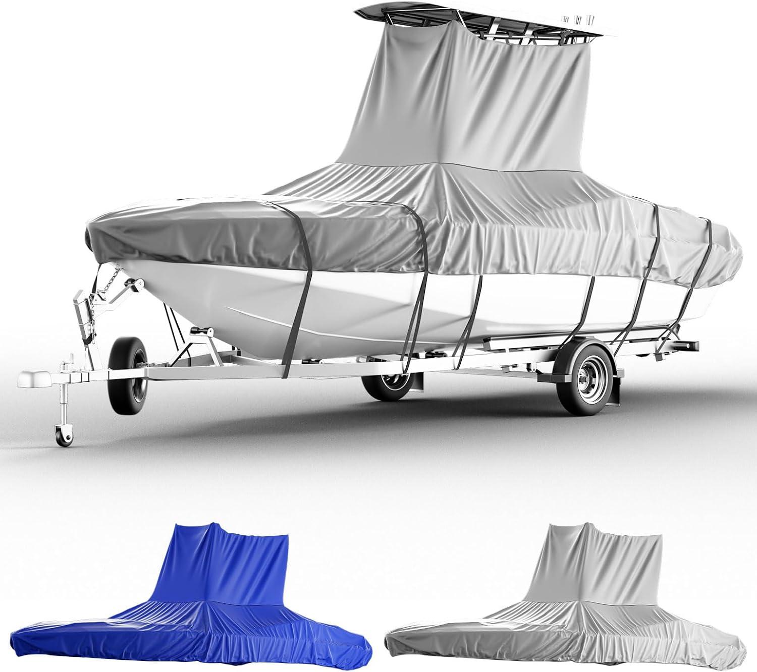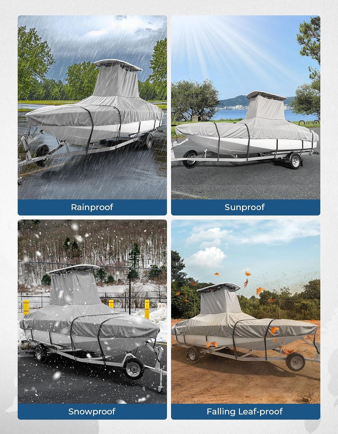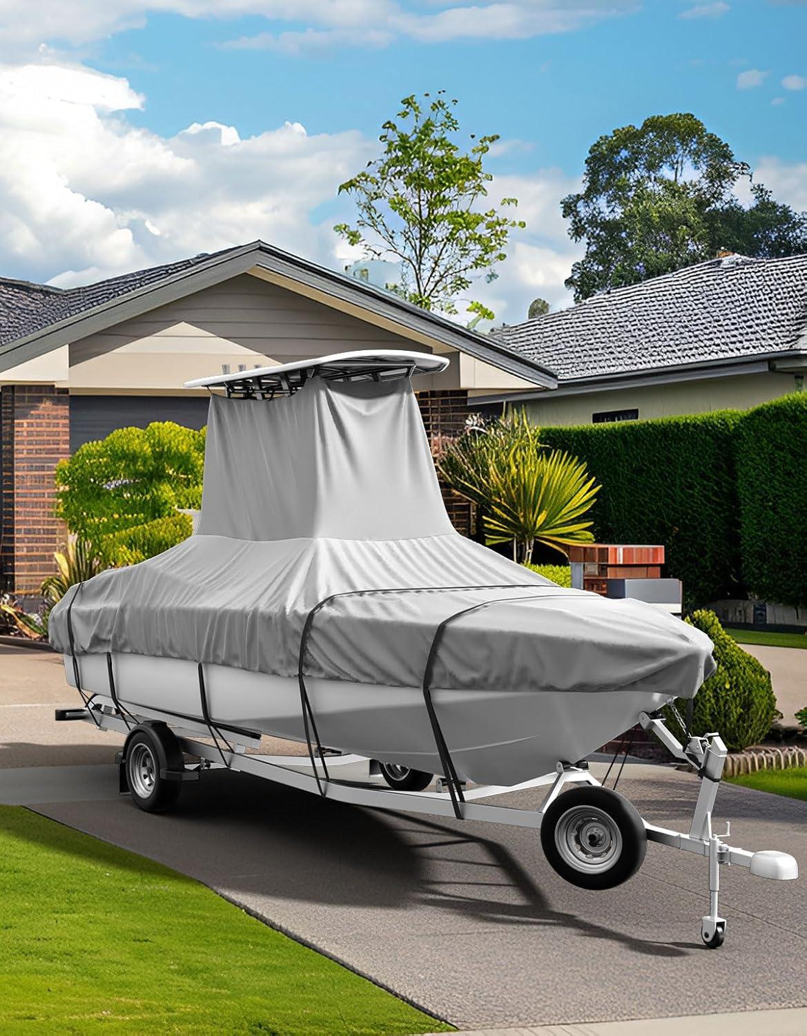 Windproof & Trailerable Design: Ideal for towing, this T TOP boat cover comes with windproof buckles and straps, including 13 top straps, 15 bottom straps, an elastic hem, and 4 cross-body straps. These features ensure that the cover remains secure even in high winds