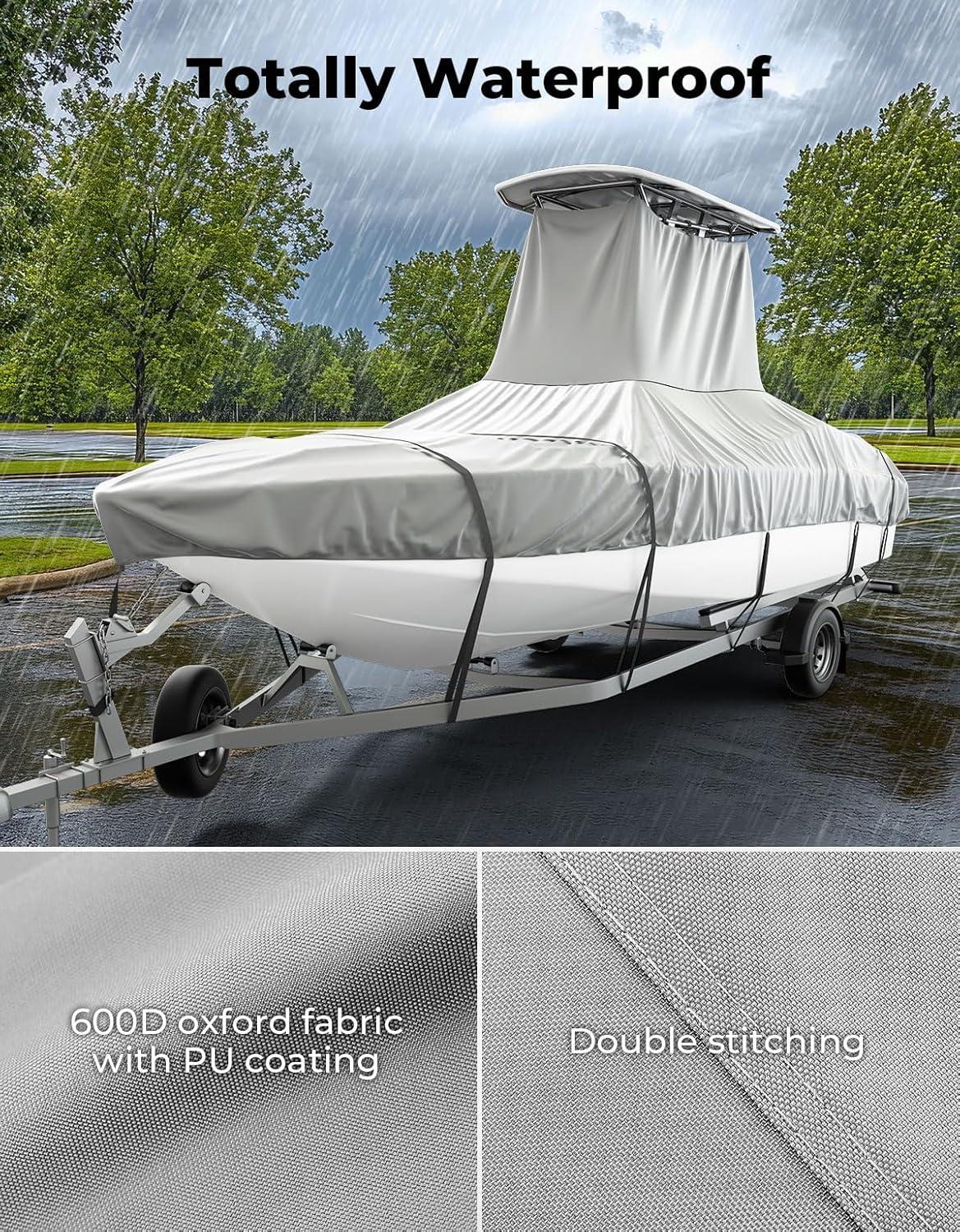 KEMIMOTO Heavy Duty 600D Oxford T-Top Boat Cover with PU Coating, Waterproof & Tear-Resistant for Center Console Boats, Fits 26-28 ft Length, Beam Width up to 116"(Gray)
