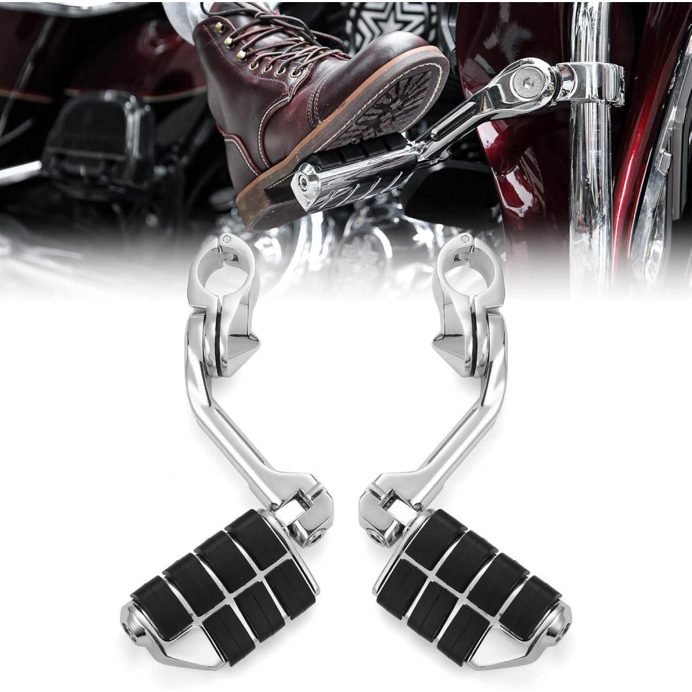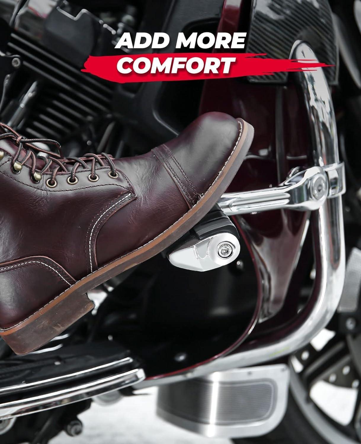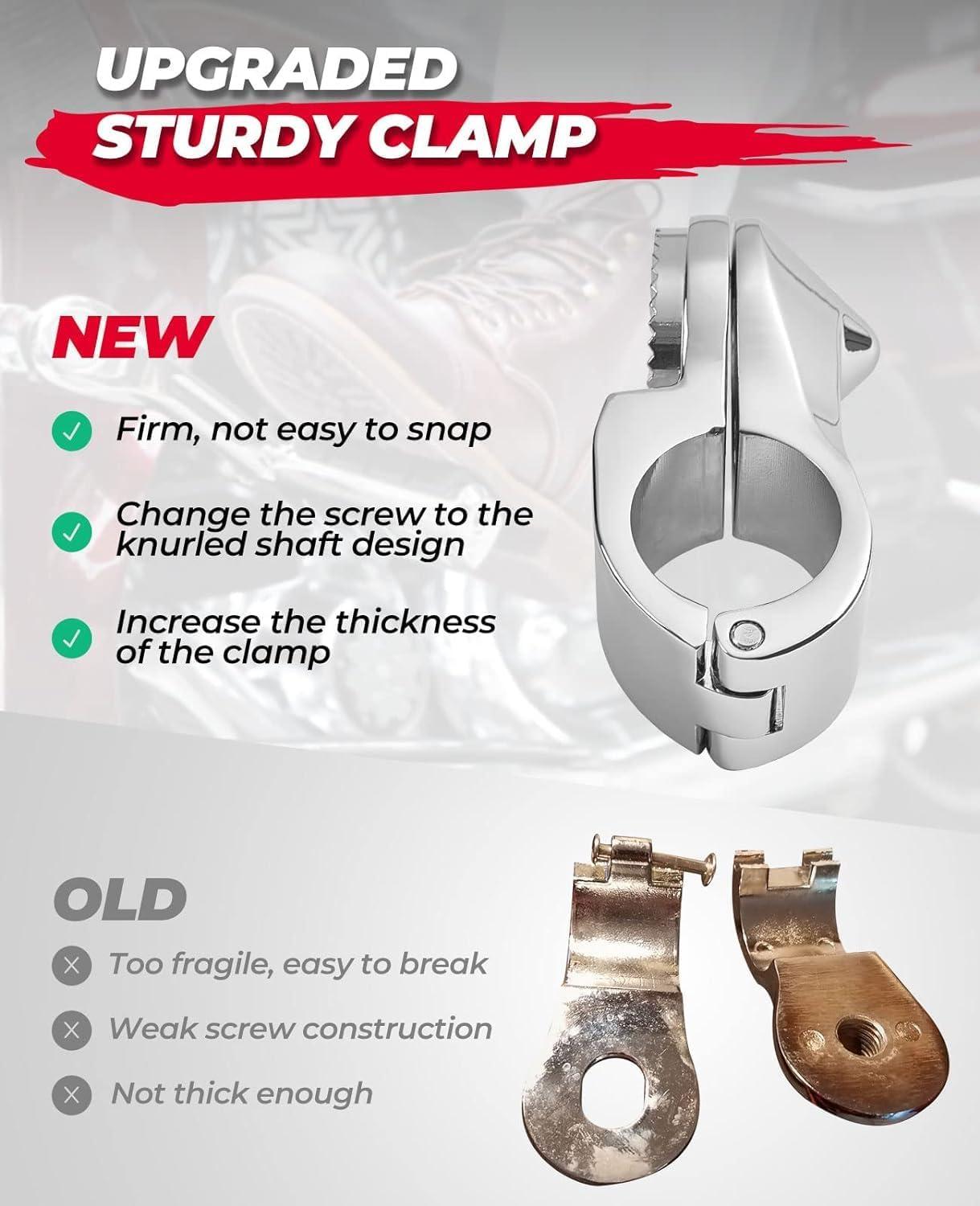 【Upgraded Clamp】Using new molds to make standard diameter clamp jigs, making the clamp fit the engine guard bars tighter. The mounting clamp is 360 degree adjustable, and the locking design secures the peg at the desired angle. Skidproof engraved durable rubber surface.