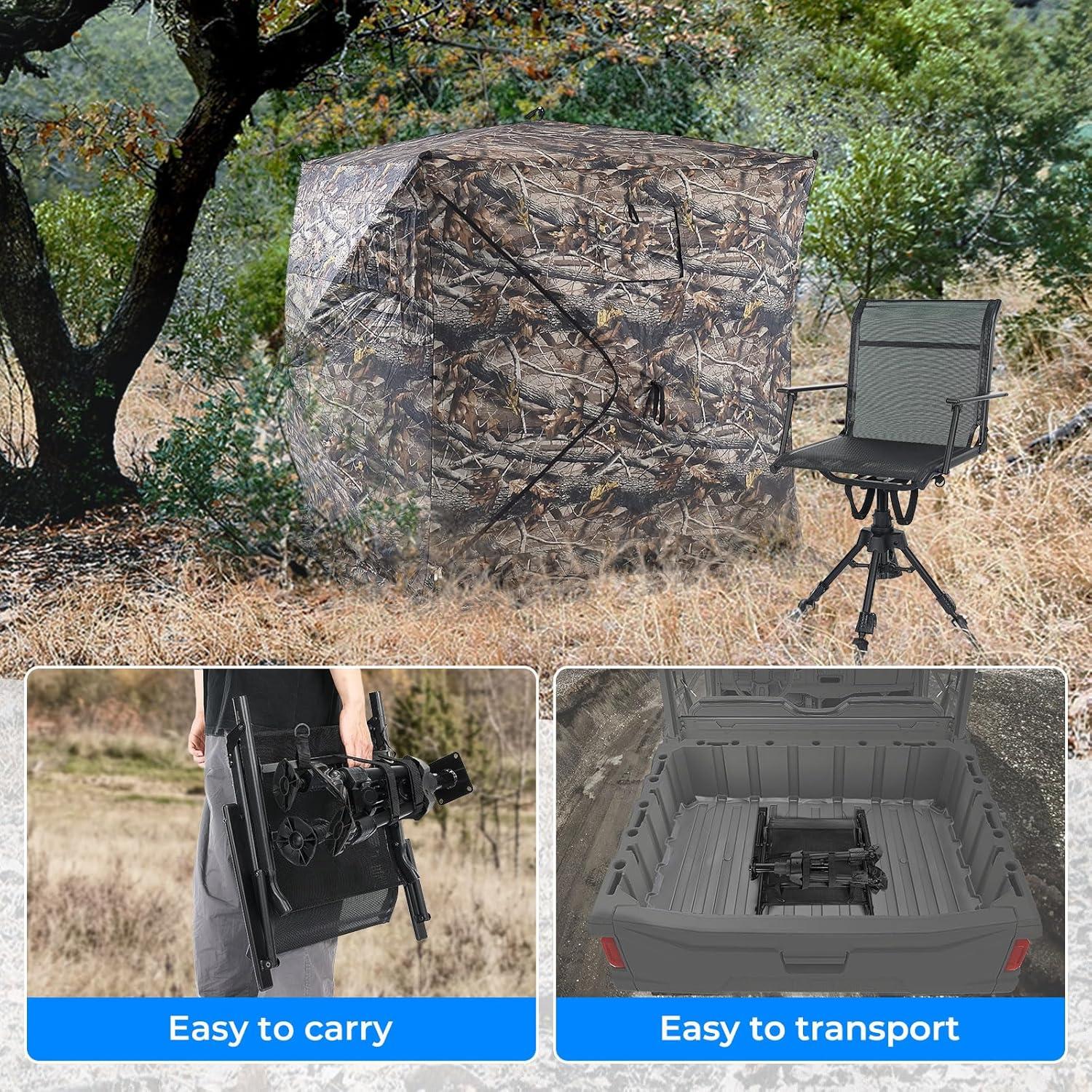 Adaptable to Any Terrain: The hunting blind chairs swivel with four sturdy swivel feet, and two independently adjustable legs which ensure a steady position on uneven terrain and prevent sinking