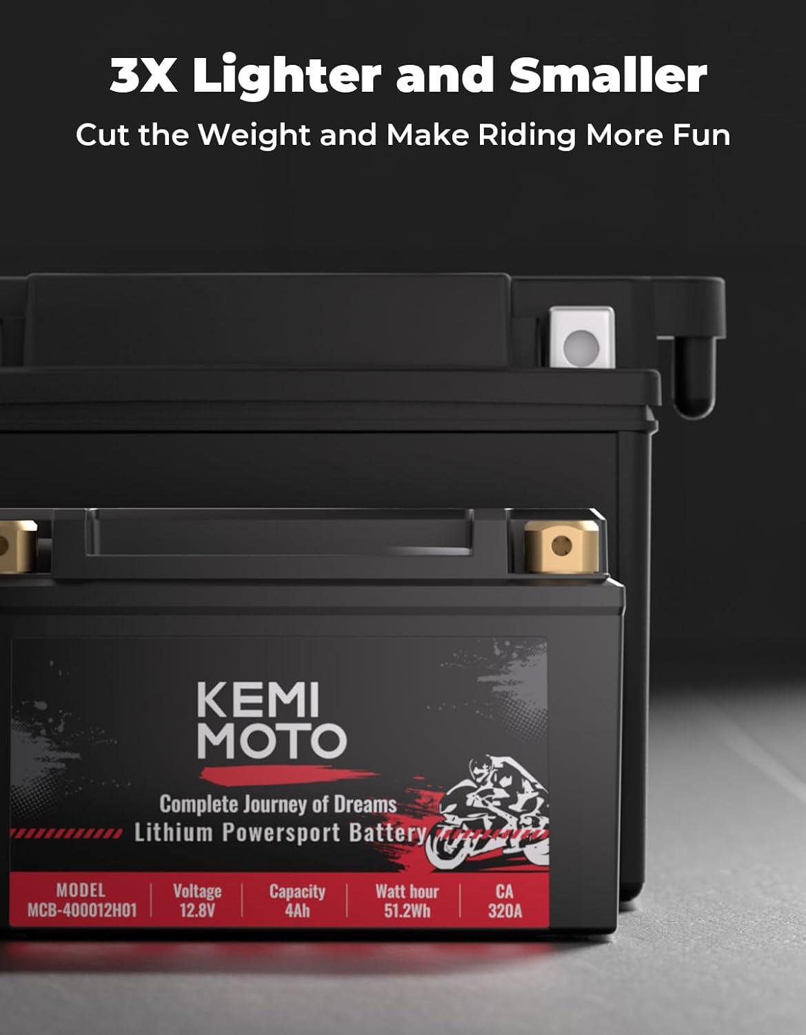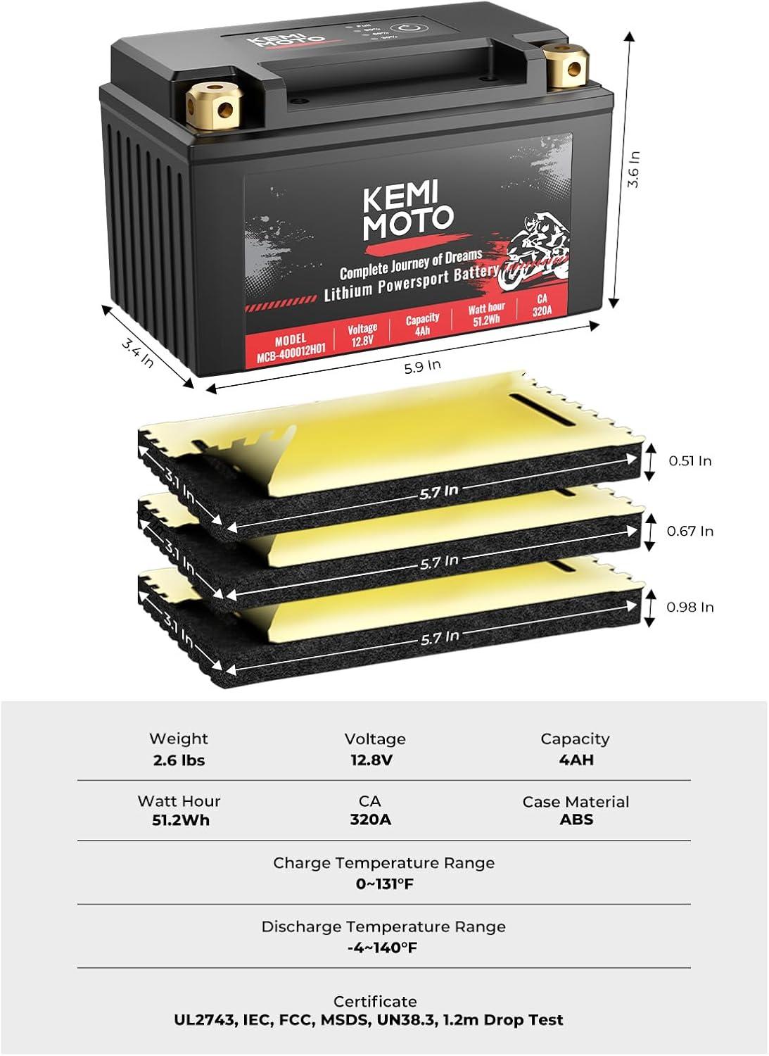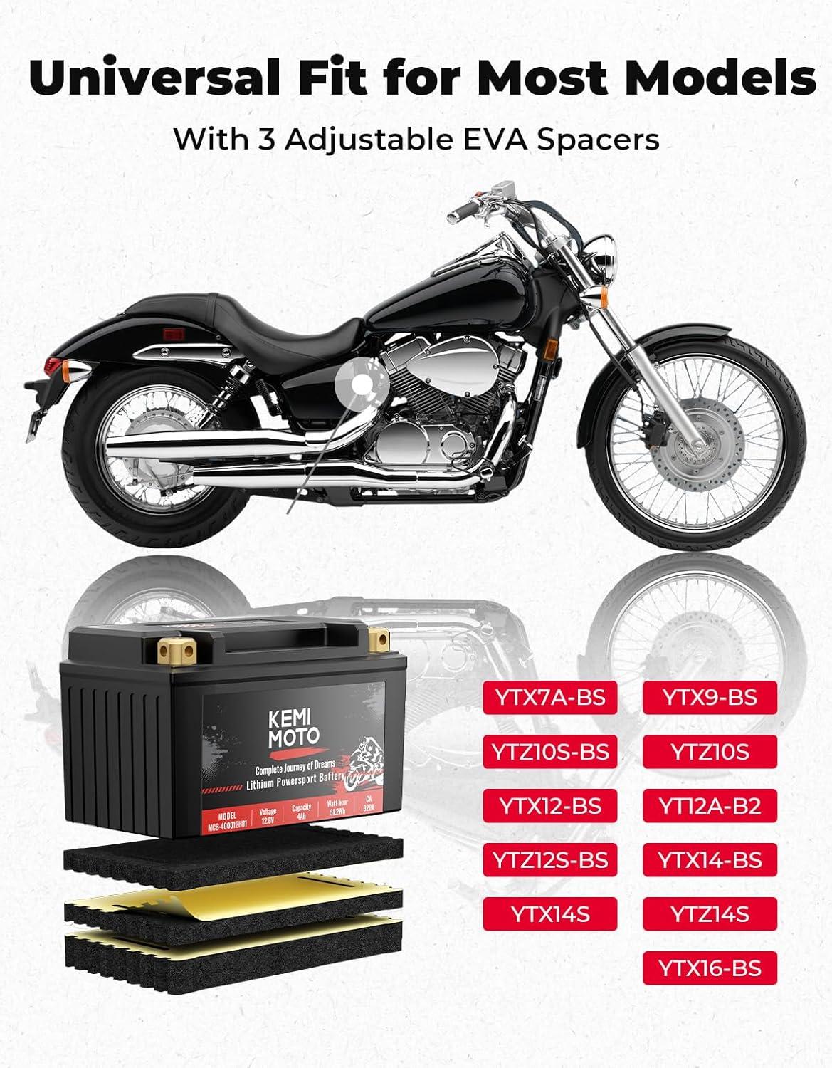 imageKEMIMOTO Lithium Motorcycle Battery YTX15LBSYTX14AHBS LiFePO4 Lithium Battery 12v 7Ah PreCharged Powersports Battery with 4 UniversalFit EVA Spacers Compatible with Motorcycle ATV Jet Ski  12V 4Ah 320CCA